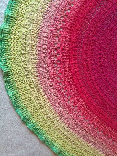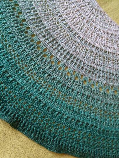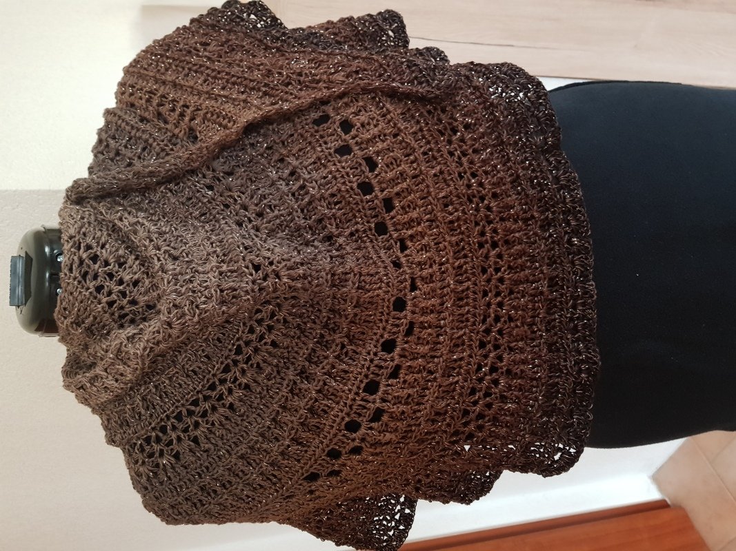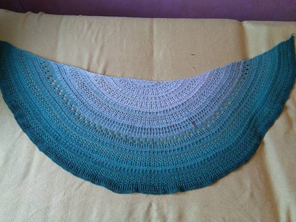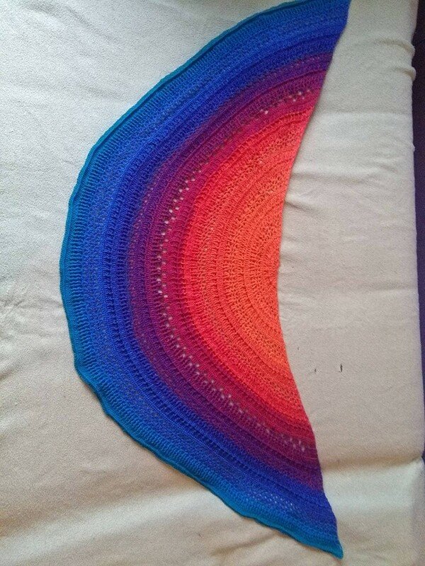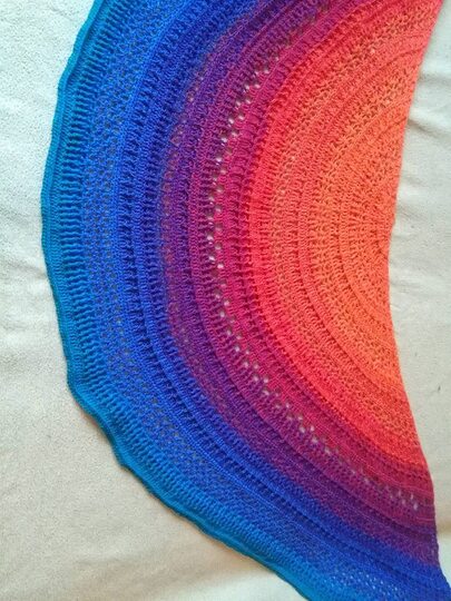 Dieses halbrunde Tuch ist bewusst kompakt damit es auch schön wärmt und als Schal mit hinguck Effekt zu tragen ist.