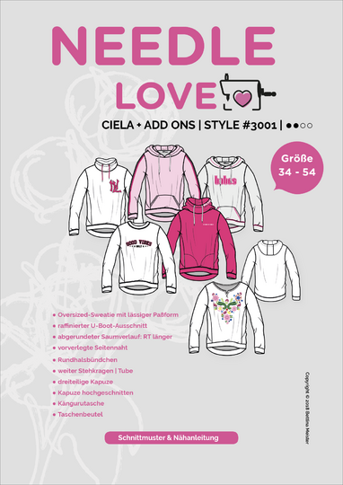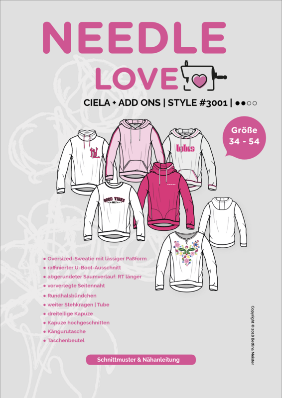 Ob als Hoodie mit verschiedenen Kapuzenvarianten, Tube-Kragen oder Rundhalsbündchen, CIELA sieht immer wieder anders aus. Du hast die Möglichkeit Nahttaschen oder eine Kängurutasche zu ergänzen.