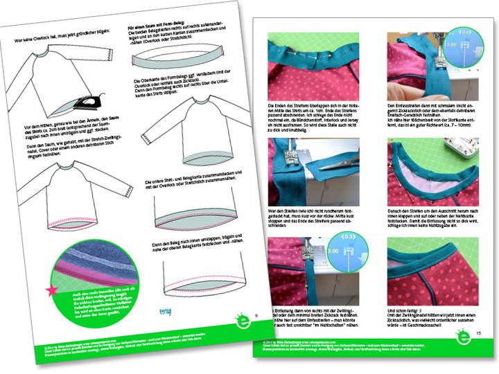 • Fototutorials für 5 verschiedene Halsausschnitte (Bündchen, eingefasst mit Falzgummi, eingefasst mit Stoff, V-Ausschnitt, Knopfleiste)