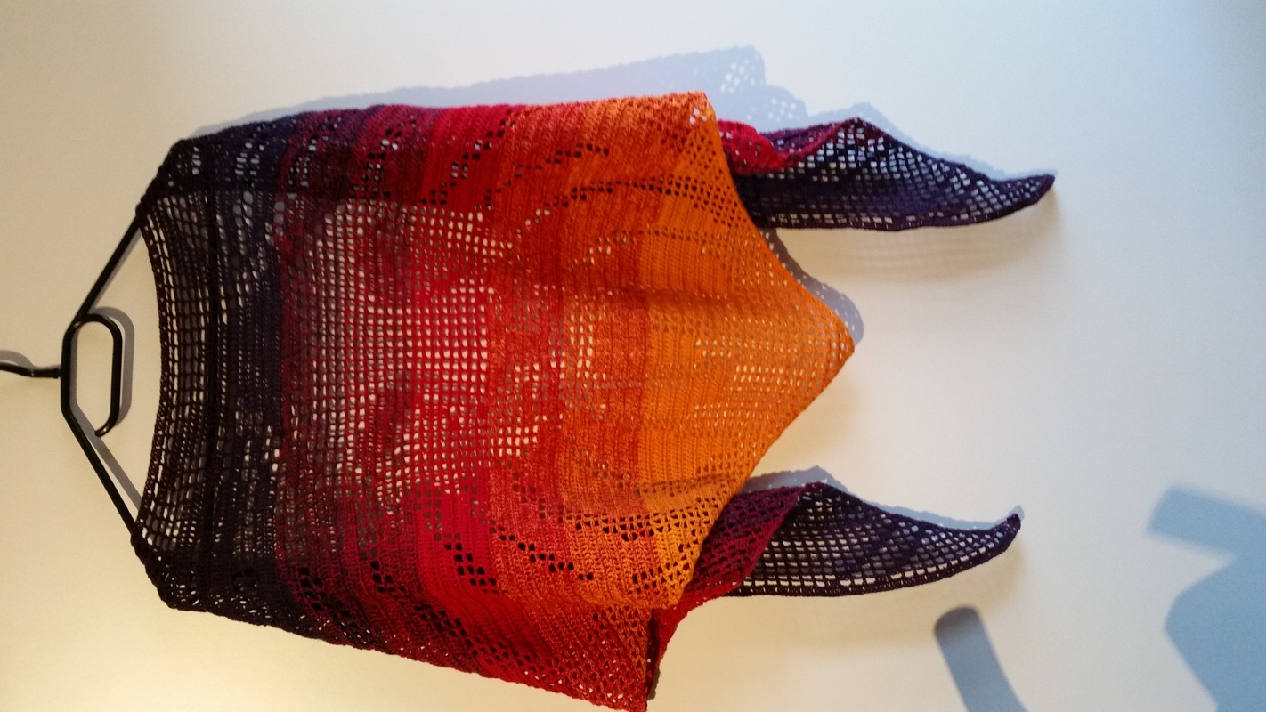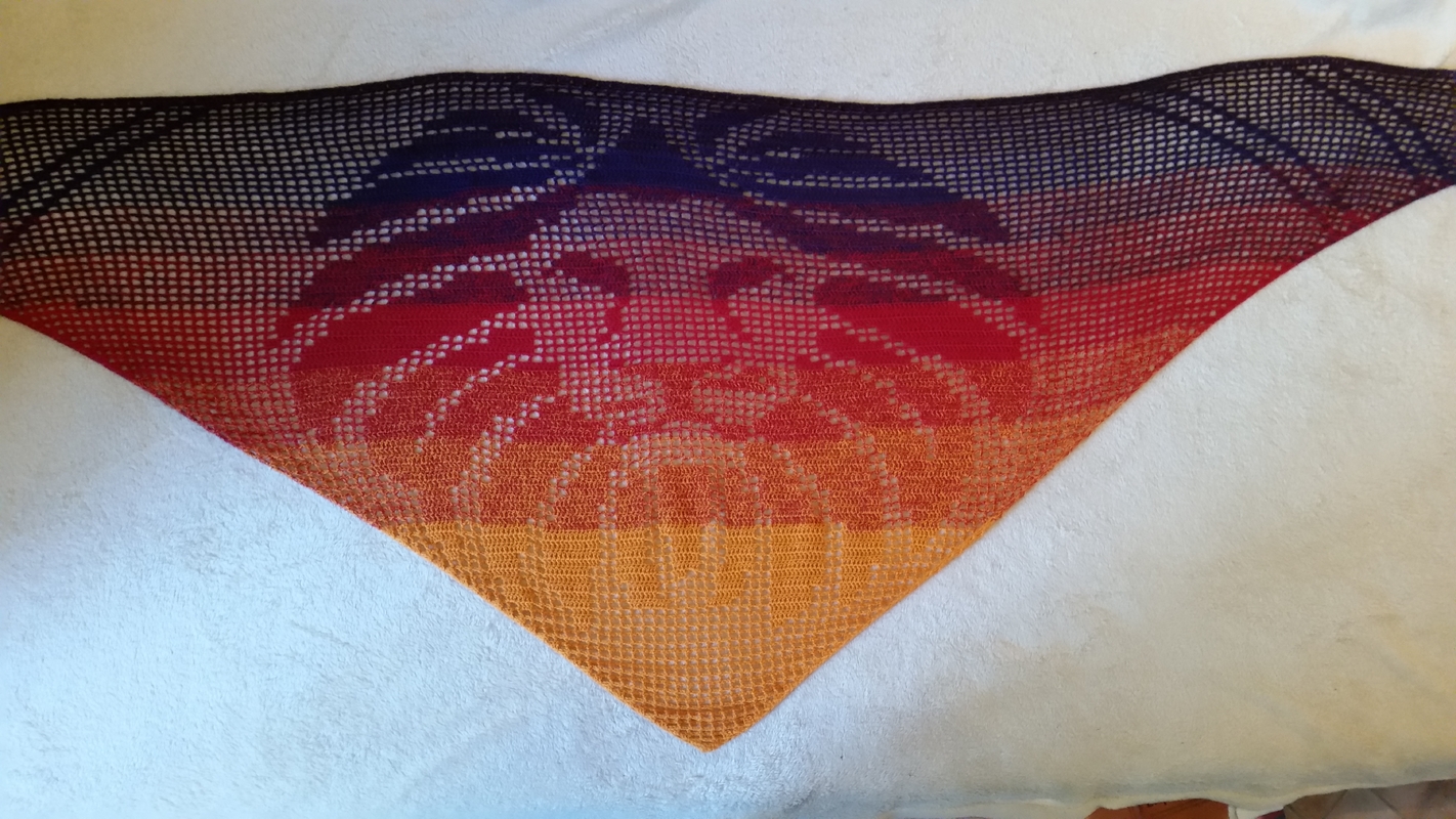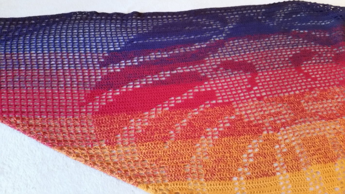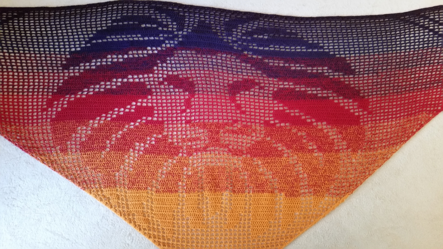 Ich habe das Motivtuch mit einem dreifädigen Farbverlaufsgarn gehäkelt, welches ich selbst gewickelt habe. Verwendet wurde ein Bobbel mit 1100m Lauflänge. Gehäkelt wurde mit einer Häkelnadel mit der Stärke 3,0.