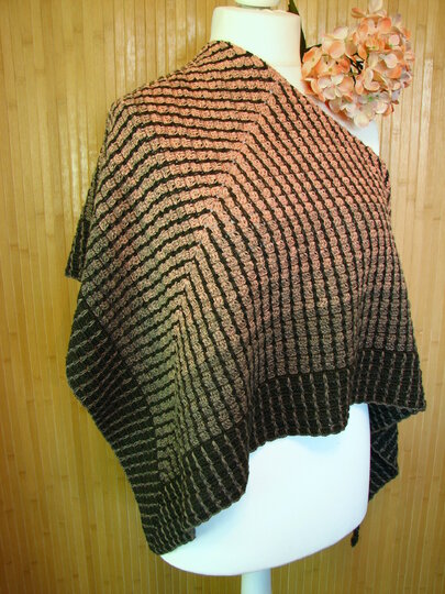 Bei meinem Tuch "Schattenspiele" handelt es sich um ein Dreieckstuch. Das Muster wird mit zwei Farben gearbeitet und besteht aus nur zwei Reihen, die sich stets wiederholen - absolut fernsehtauglich.
