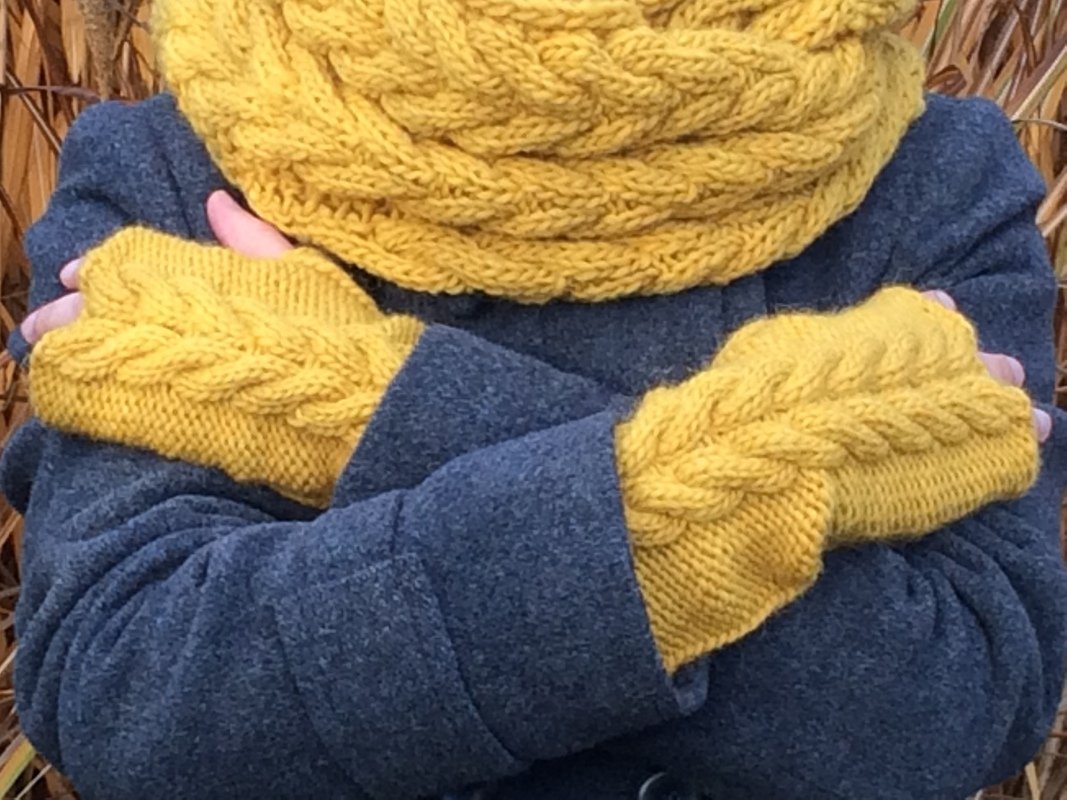 rechte und linke Maschen, Maschen verzopfen, aus einem Querfaden eine Masche rechts verschränkt herausstricken, Umgang mit einem Nadelspiel;