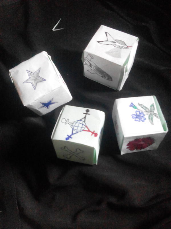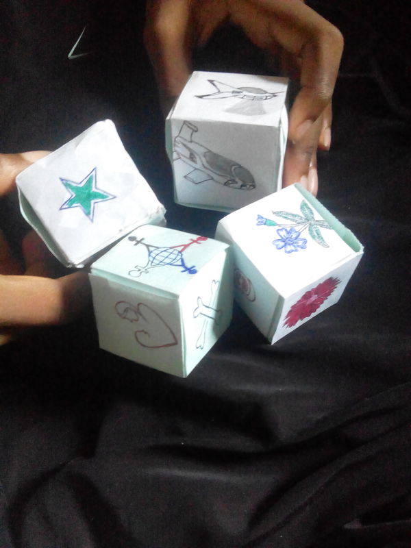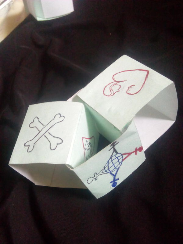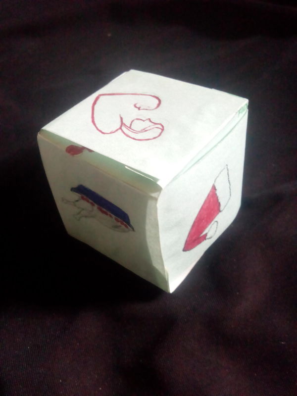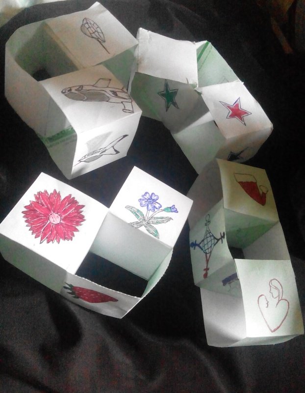 This puzzle is suitable for children and adults. While some faces are blank, the others are with pictures. It is made up of 3 links of paper that can be made into a cube, so the faces can be changed. The aim of the game is to turn the links such that the blanks and/or the pictures show in a variety of ways.