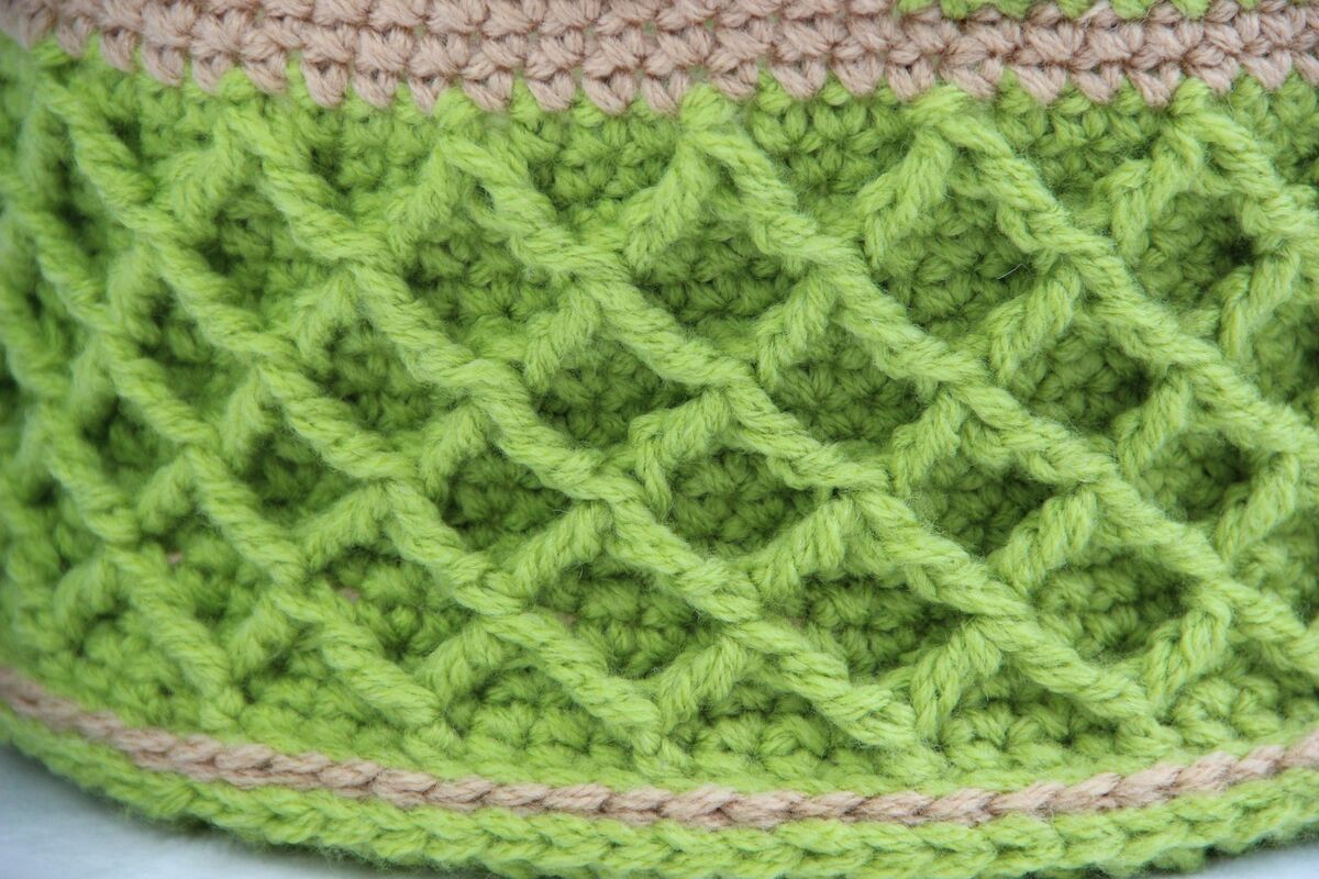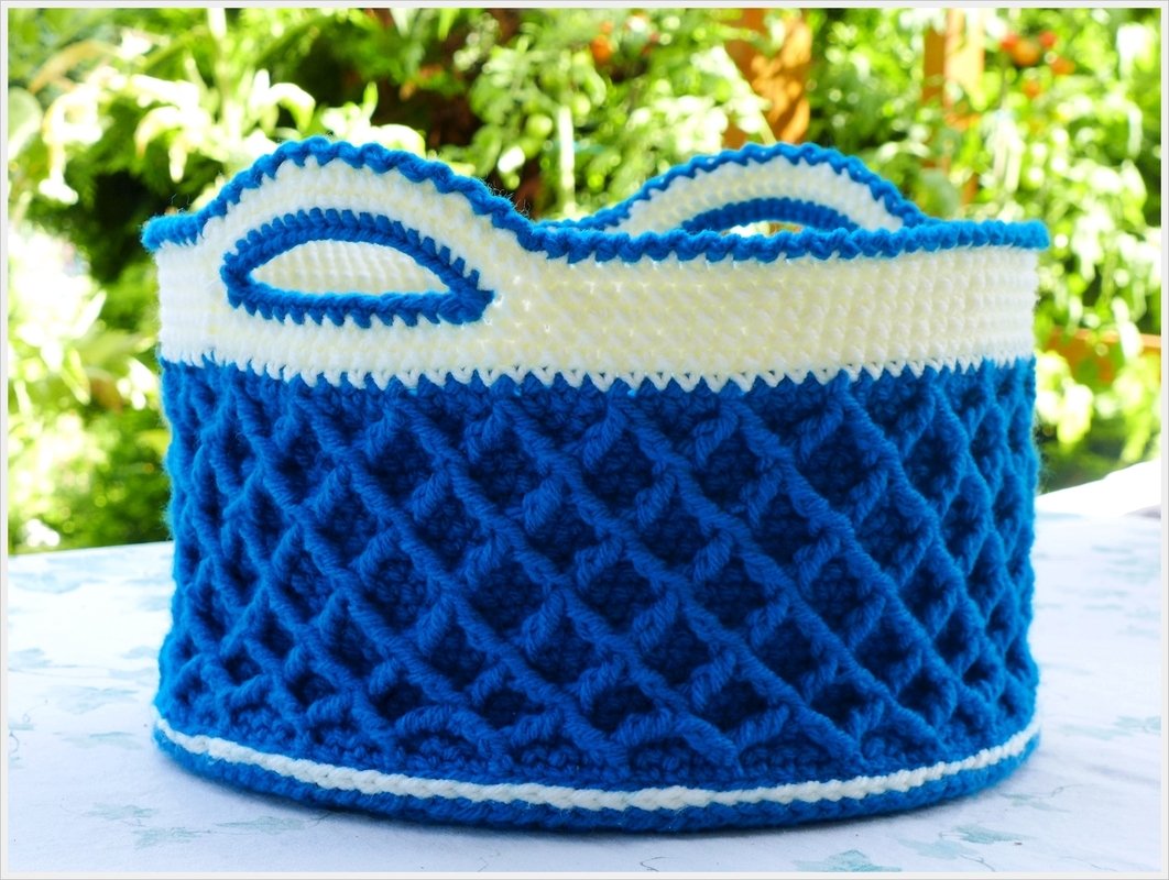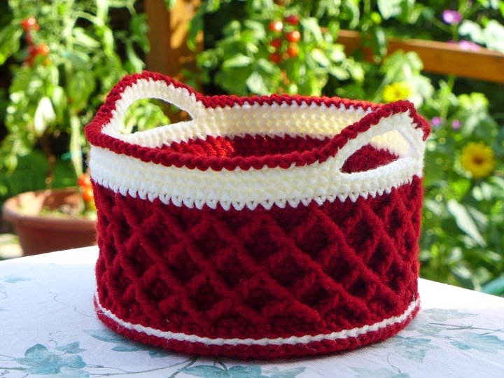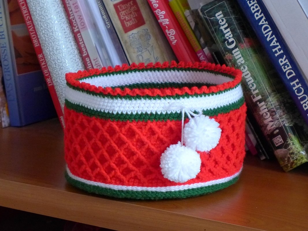 Der große Korb ist 31 cm im Durchmesser und 19 cm hoch (ohne Henkel). Ihr könnt ihn in verschiedenen Größen fertigen.