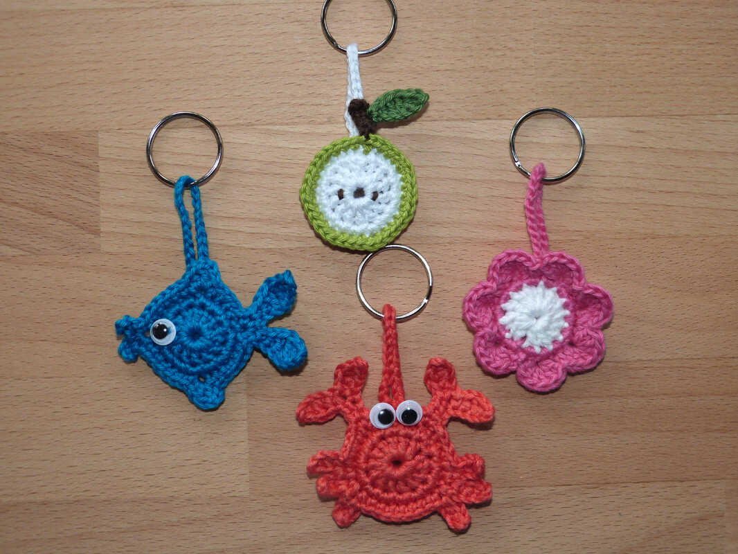 Bei Verwendung von Baumwollgarn mit einer Lauflänge von ca. 125m/50g und Nadelstärke 2,5 werden die Anhänger so groß, dass ein Chip oder eine Euro-Münze hinein passt. Zusätzlich brauchst du noch einen Schlüsselring.