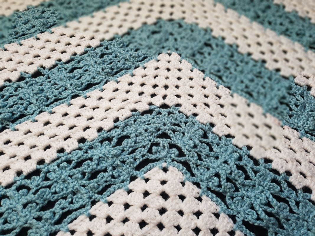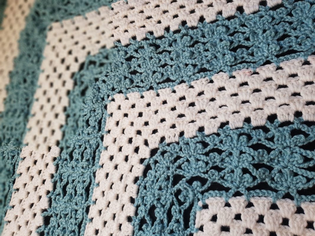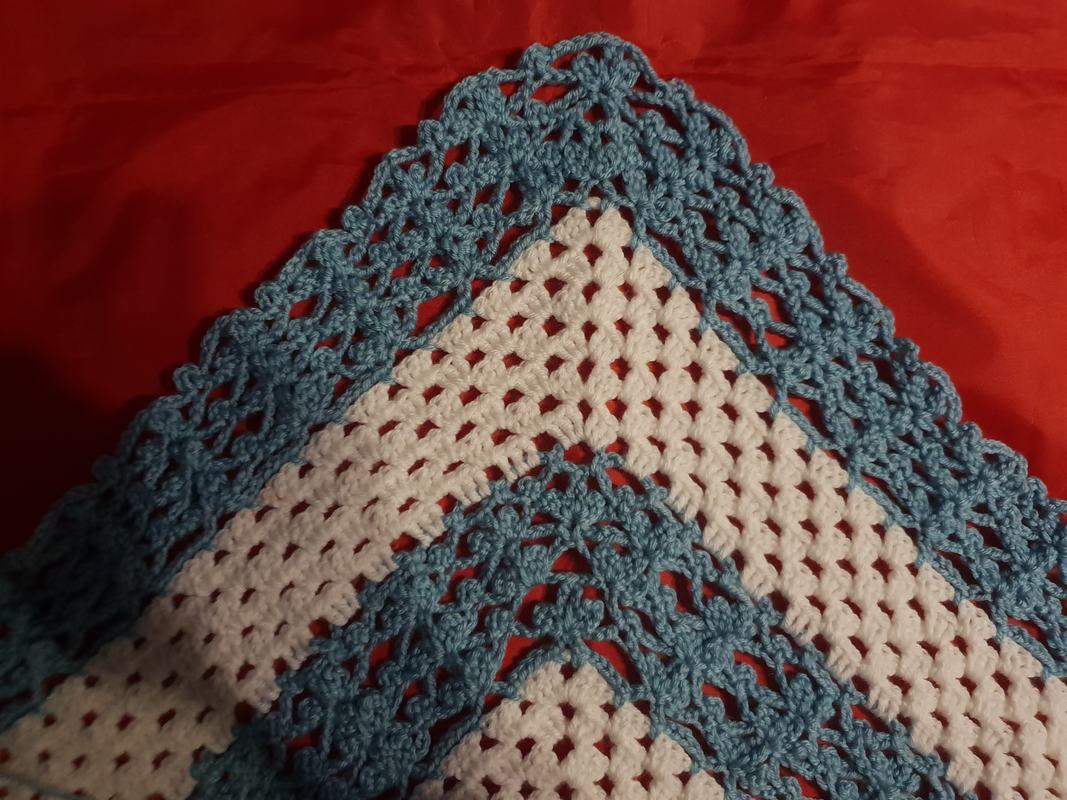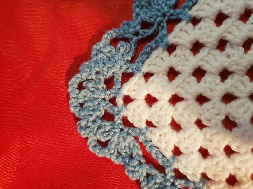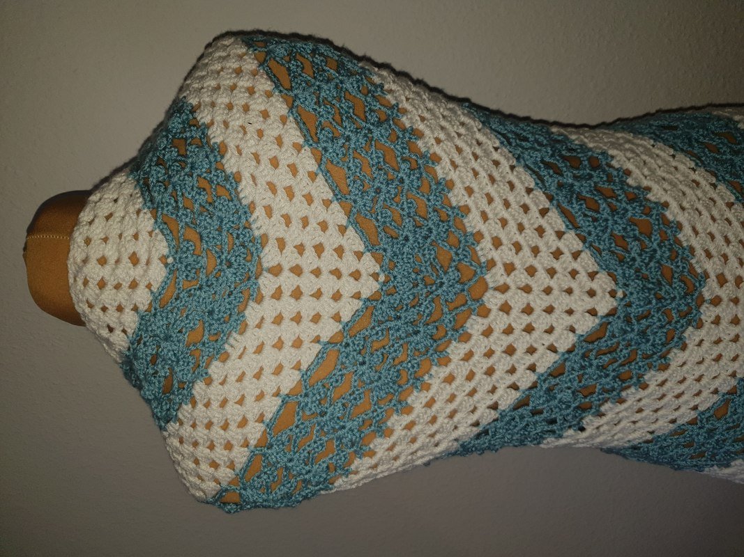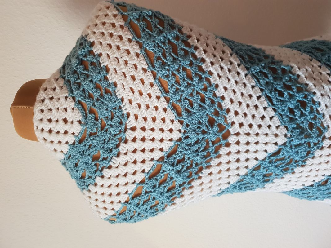 Ich habe für mein Tuch ca. 350 gr. Gründl Happy (Anti-Pilling) Weiß und Hellblau je 50:50 verwendet (100 g = 250 m LL – 100 % Polyester) empfohlene Nadelstärke 4,5
