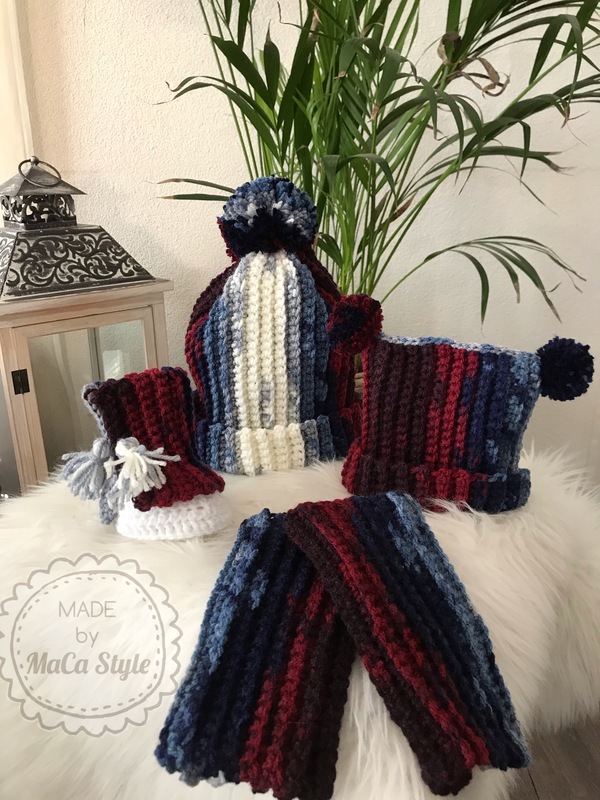 Dieses bezaubernde MuKi Set besteht aus 4 Anleitungen: Mütze, Stulpen, Babymütze & Boots und wurden aus ca 3 mal 100g Alize Burcum Batik und etwas Babywolle (50g = 135m) hergestellt.