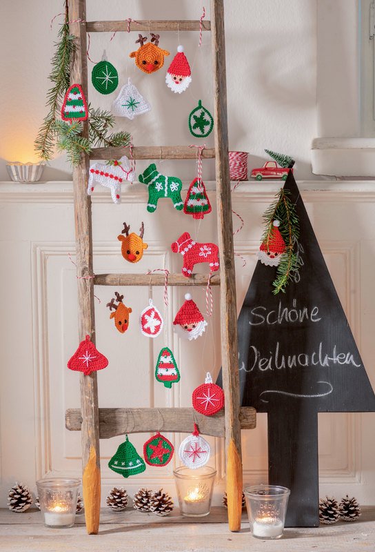 Gehäkelte Glocken, Weihnachtskugeln, Pferdchen, Mini-Bäumchen – hier finden Sie lauter Kleinigkeiten, die sich perfekt als Christbaumschmuck eignen. Die süßen Häkelteile machen sich super an einer Tannengirlande und wer keinen Kamin hat, schmückt seinen Haus- oder Wohnungseingang.