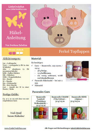 Vervielfältigung und Veröffentlichung dieser Anleitung – mechanisch, elektronisch oder auf andere Weise einschließlich Fotokopie - ohne schriftliche Genehmigung ist untersagt! Ich arbeite sehr hart, um diese Anleitungen zu entwerfen und zu Papier zu bringen. Vielen Dank für Ihr Verständnis, und viel Spaß beim Häkeln!