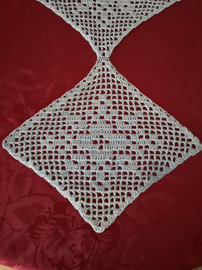 Die Anleitung ist auf 6 Seiten Schrift (Erklärung Filethäkeln), der Anfang des Tischläufers in Häkelschrift (PC-Häkelschrift) und Zählraster geschrieben.