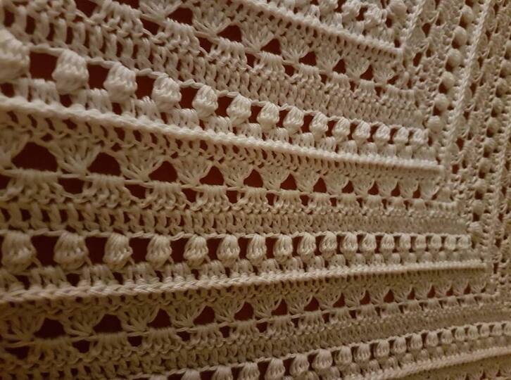 Luftmaschen, feste Maschen, Stäbchen, Kreuzstäbchen, Popcorn-Maschen und vordere Reliefstäbchen.