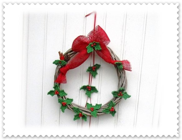 Basis ist ein Weidenkranz, gehäkelte Ilex Blätter verleihen ihm einen besonderen Charme.