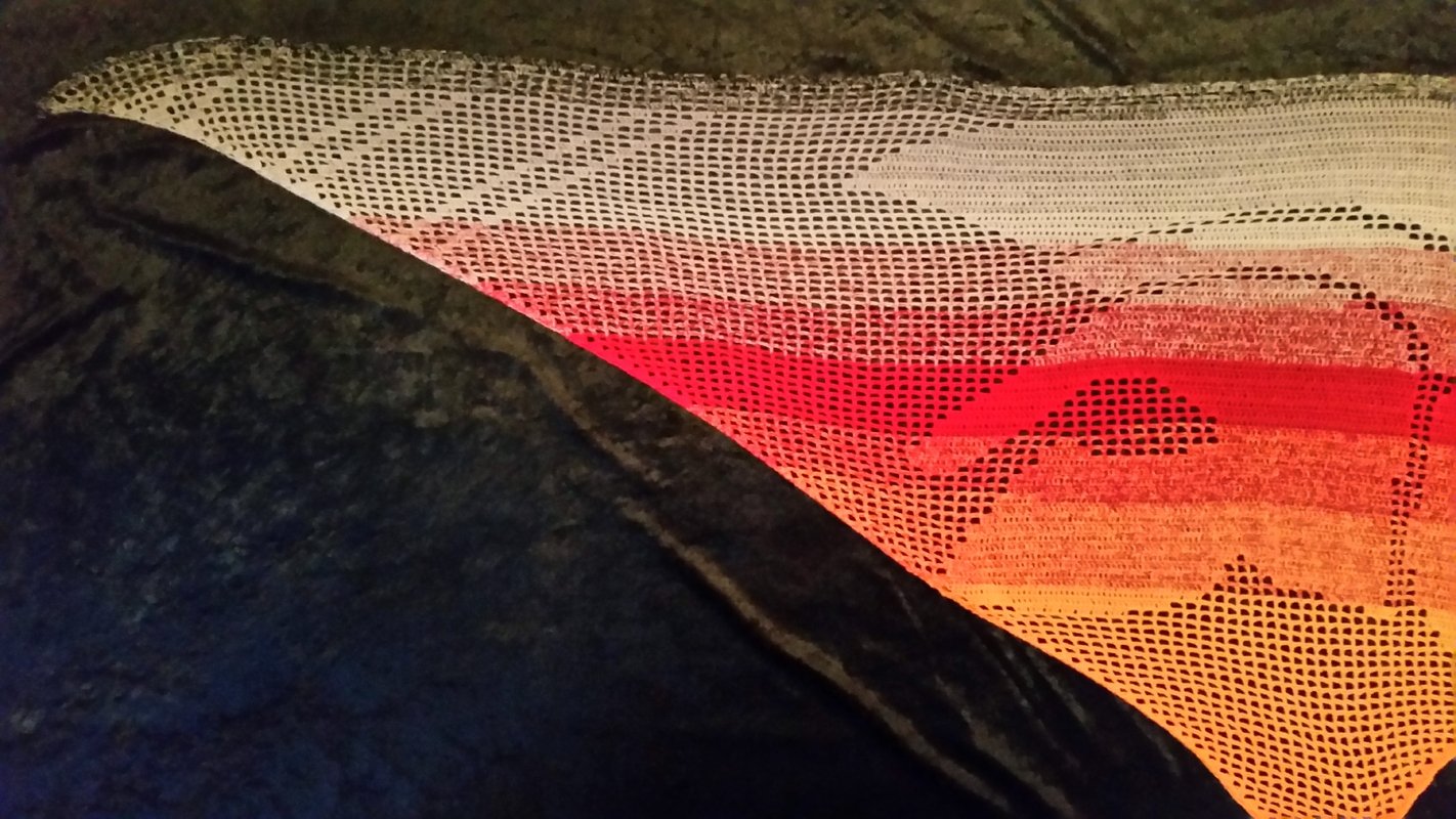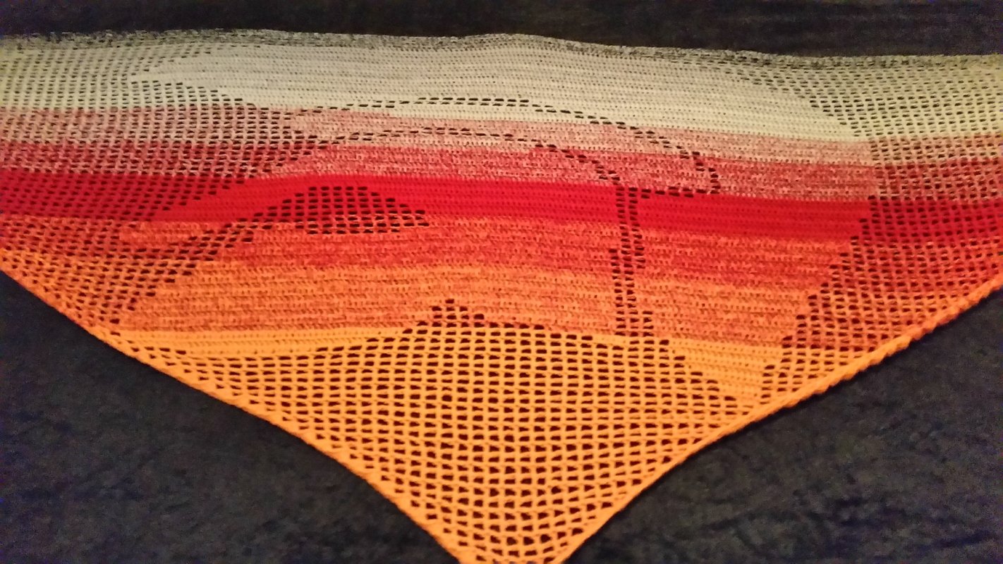 Ich habe das Motivtuch mit einem dreifädigen Farbverlaufsgarn gehäkelt, welches ich selbst gewickelt habe. Verwendet wurde ein Bobbel mit 1100m Lauflänge. Gehäkelt wurde mit einer Häkelnadel mit der Stärke 3,0.