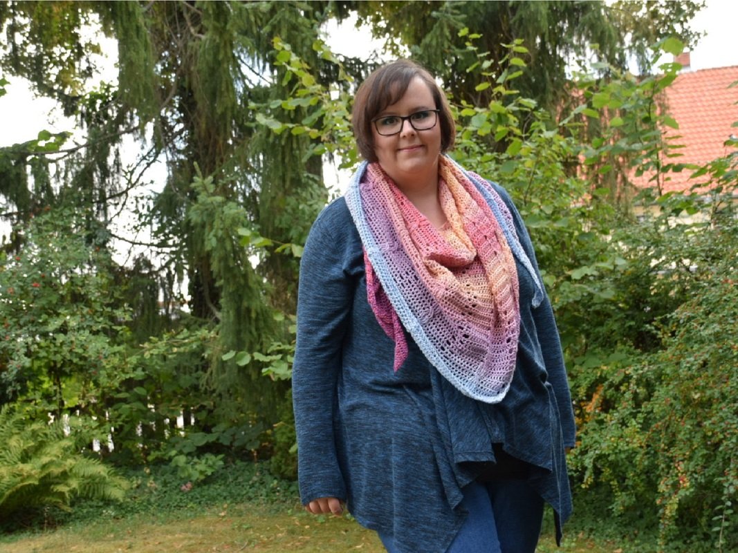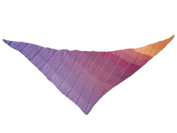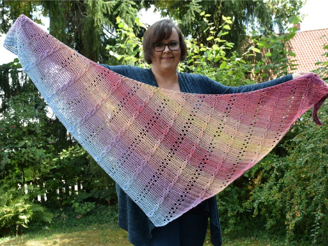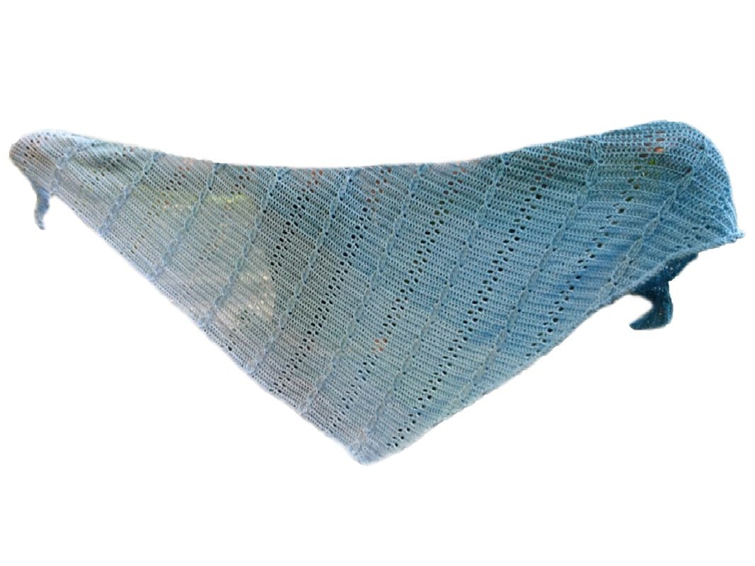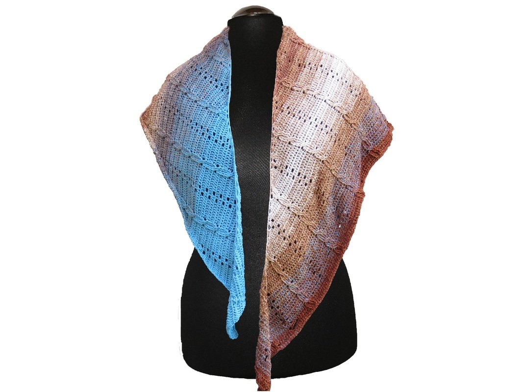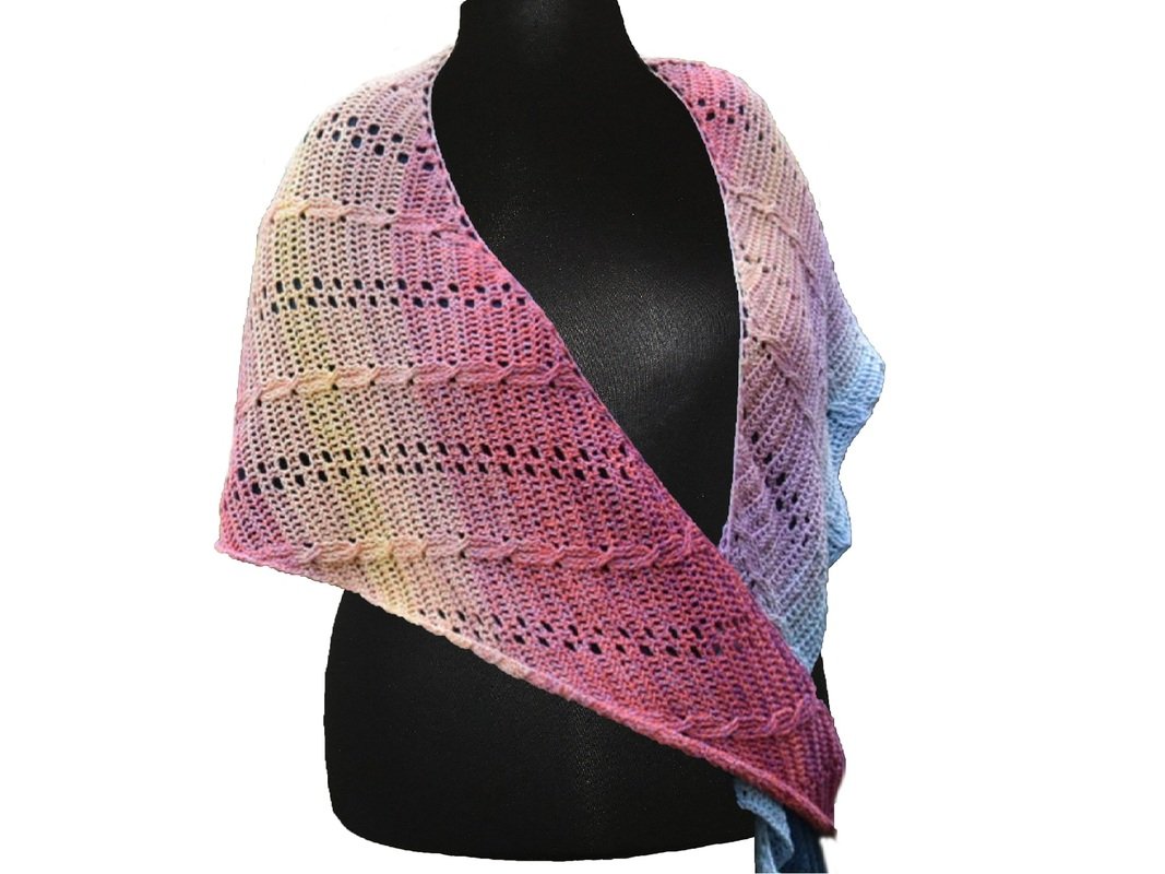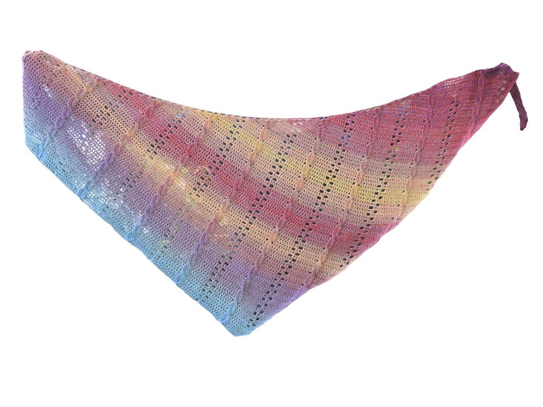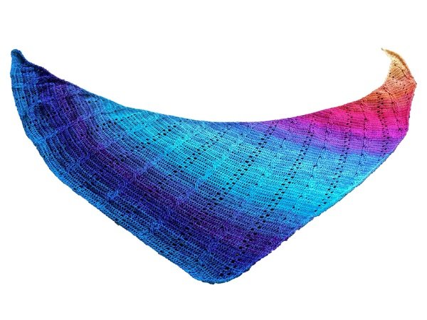 Das Tuch wird von einem Zipfel (lilanes rechtes Ende siehe Bild) aus gehäkelt und ist asymmetrisch. Das bedeutet, dass die Reihen immer länger werden und auch eine Seite des Dreiecks bilden (Blaue linke Seite).