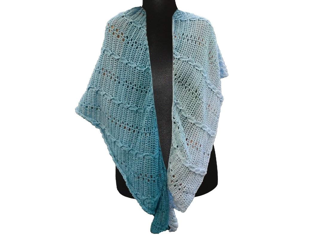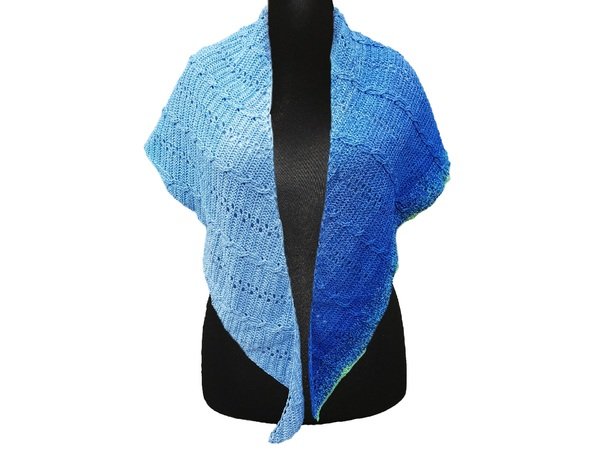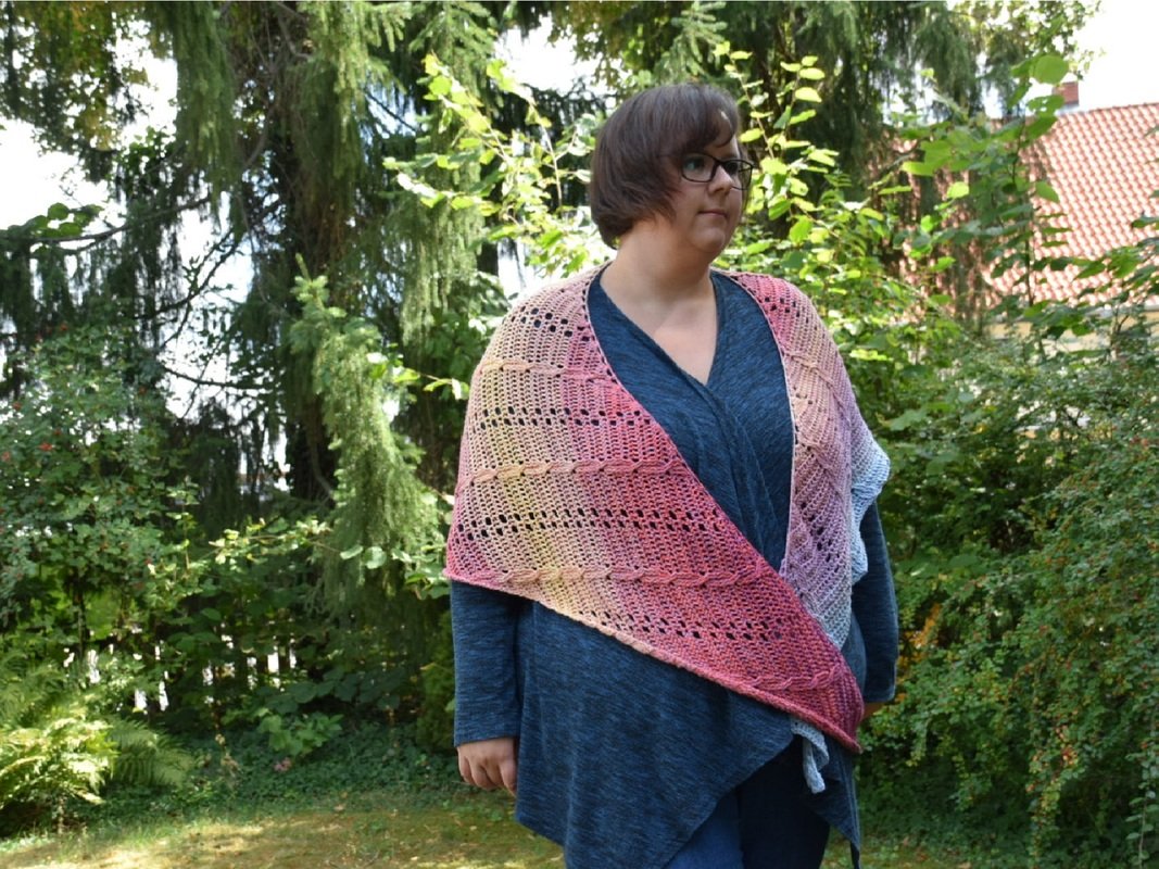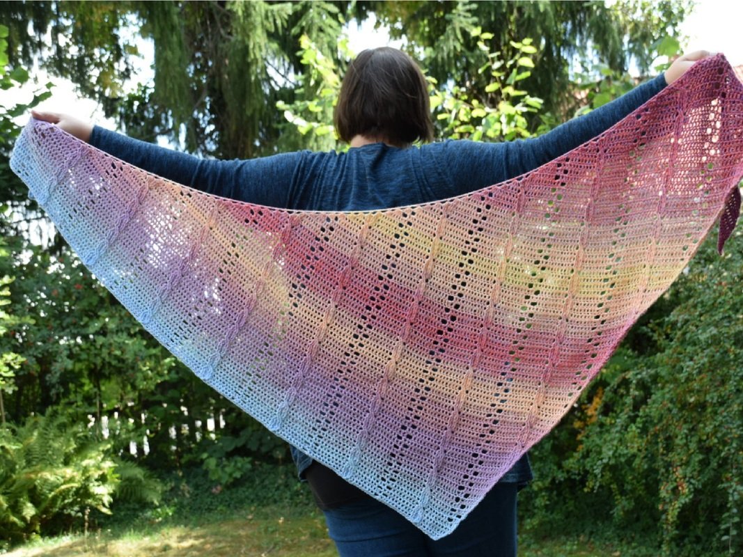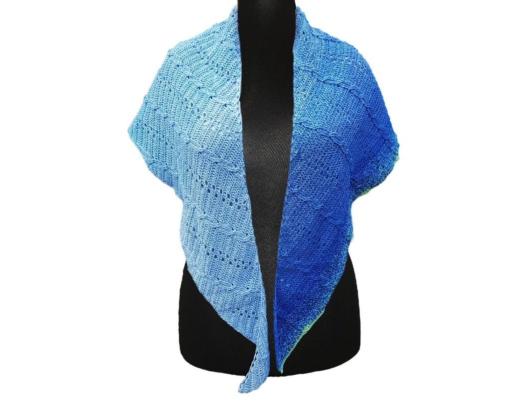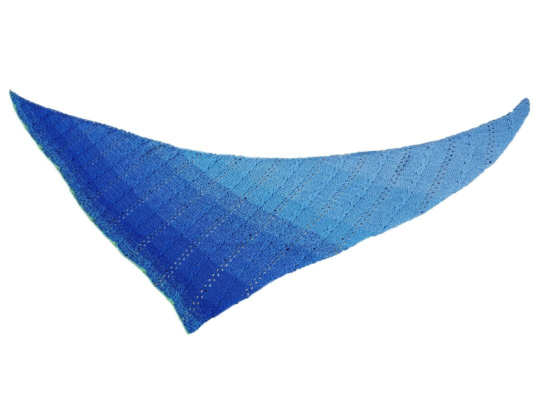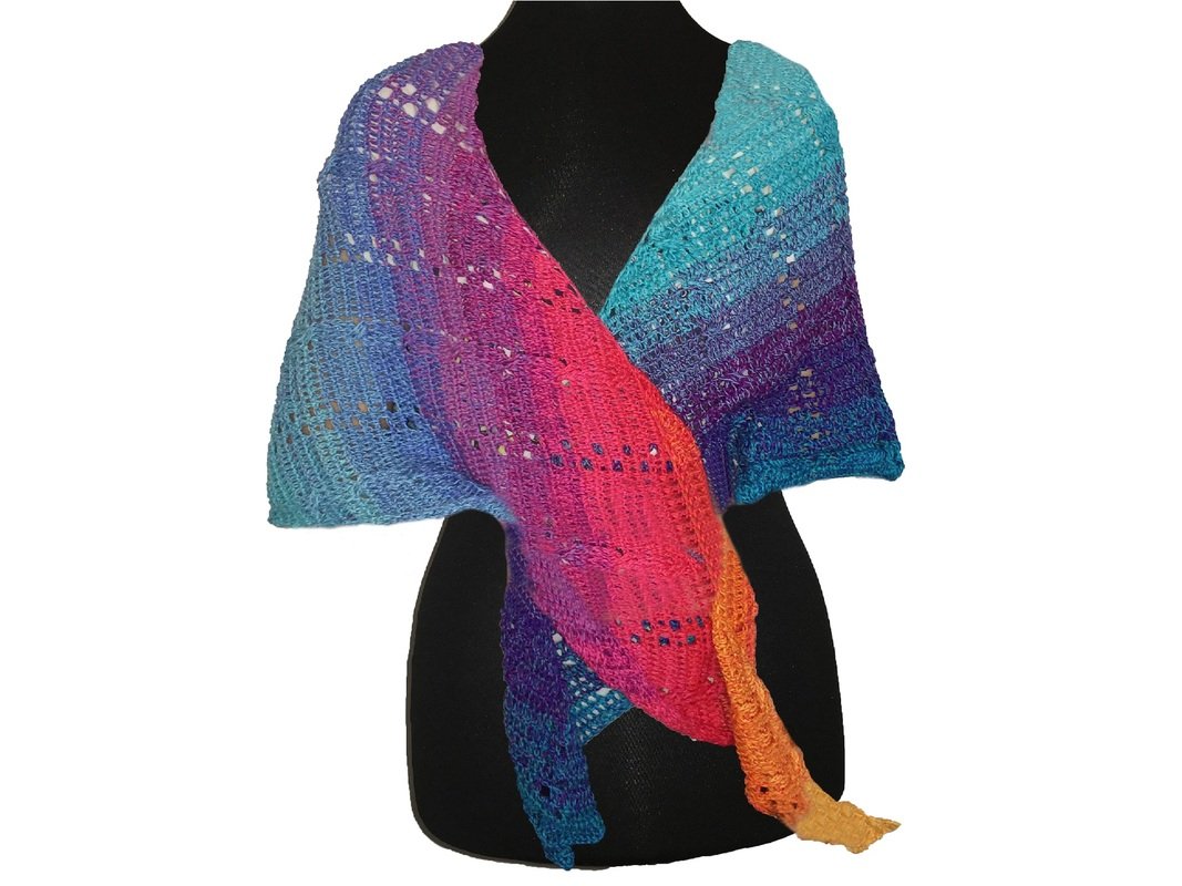 Das Tuch wird von einem Zipfel (lilanes rechtes Ende siehe Bild) aus gehäkelt und ist asymmetrisch. Das bedeutet, dass die Reihen immer länger werden und auch eine Seite des Dreiecks bilden (Blaue linke Seite).