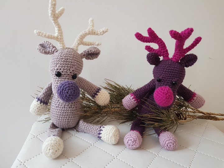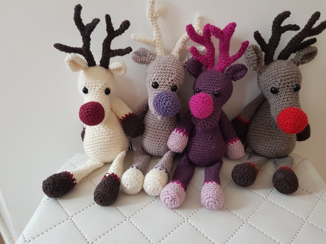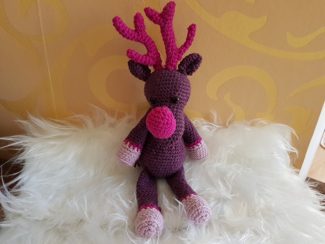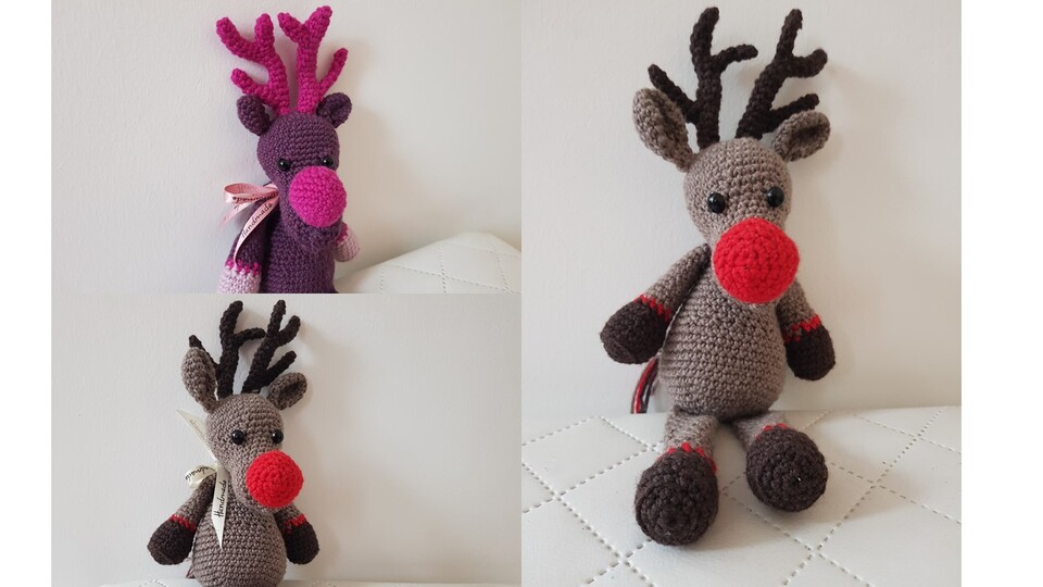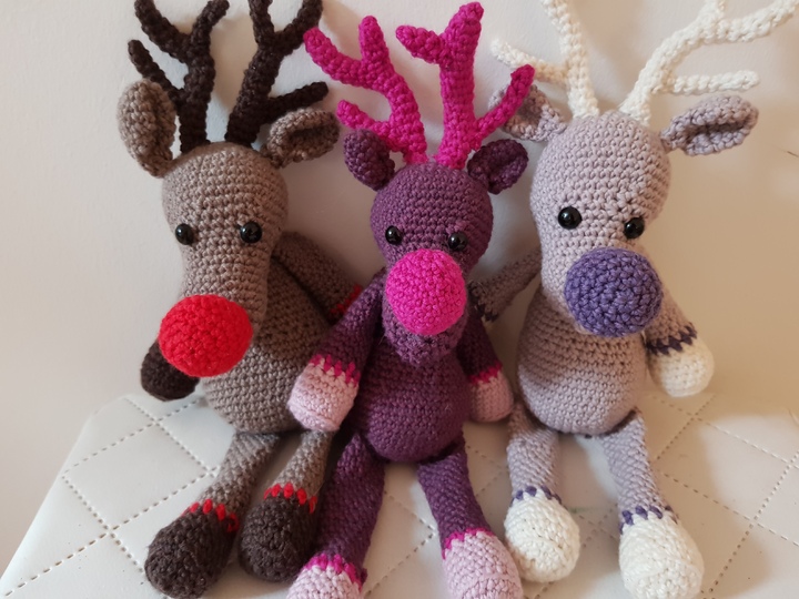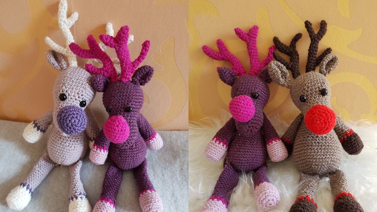 Inspiriert von dem berühmten Song "Rudolph the red nosed Reindeer" habe ich mich daran gemacht, eine Häkelanleitung für ein Rentier zu entwicklen. Da ich pink aber viel lieber mag als rot, ist mein Rentier ein Mädchen geworden und hat eine pinke Nase :-). Es spricht aber natürlich gar nichts dagegen, die Farben nach Belieben zu ändern. Auf den Fotos seht ihr auch andere Varianten und Farbkombinaten (klassisch braun + rote Nase ist auch dabei).