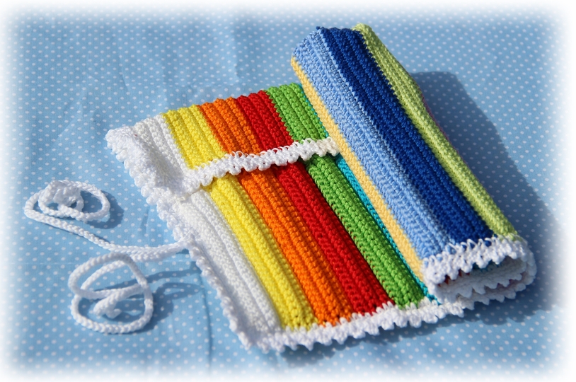 Wohin mit den Buntstiften oder Pinseln der Enkel oder den eigenen Häkelnadeln? Ich hätte da eine schöne Idee für Euch: Eine Stifte-Rolle. Länge und Breite der Rolle sind variabel. Man häkelt so viele Fächer wie man braucht.