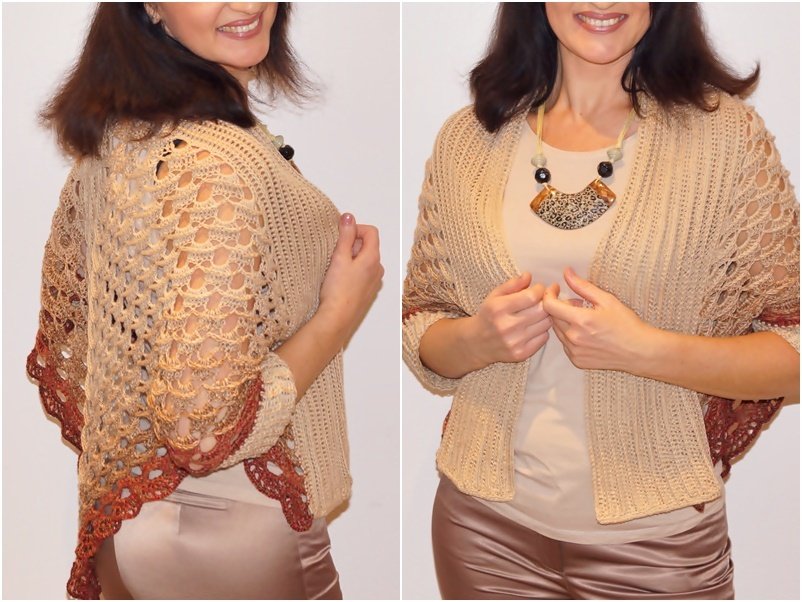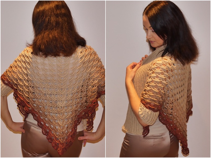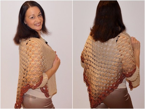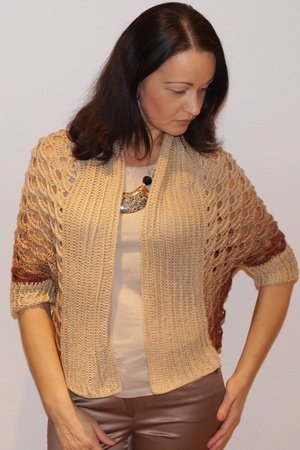 Material: Ich habe für diesen Seelenwärmer (in Gr. 38/40) ein 4-fädiges, gefachtes Farbverlaufsgarn genommen: 200 g (760 m LL), plus für die Ärmeln 120 g (400 m LL). Also habe ich insgesamt 320 g Wolle verbraucht.