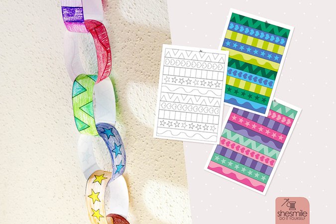 Bastelanleitung und Druckvorlage gestaltet als PDF-E-Book für eine Dekokette aus Papierstreifen zum Ausmalen, Schneiden üben und Basteln für Groß und Klein.