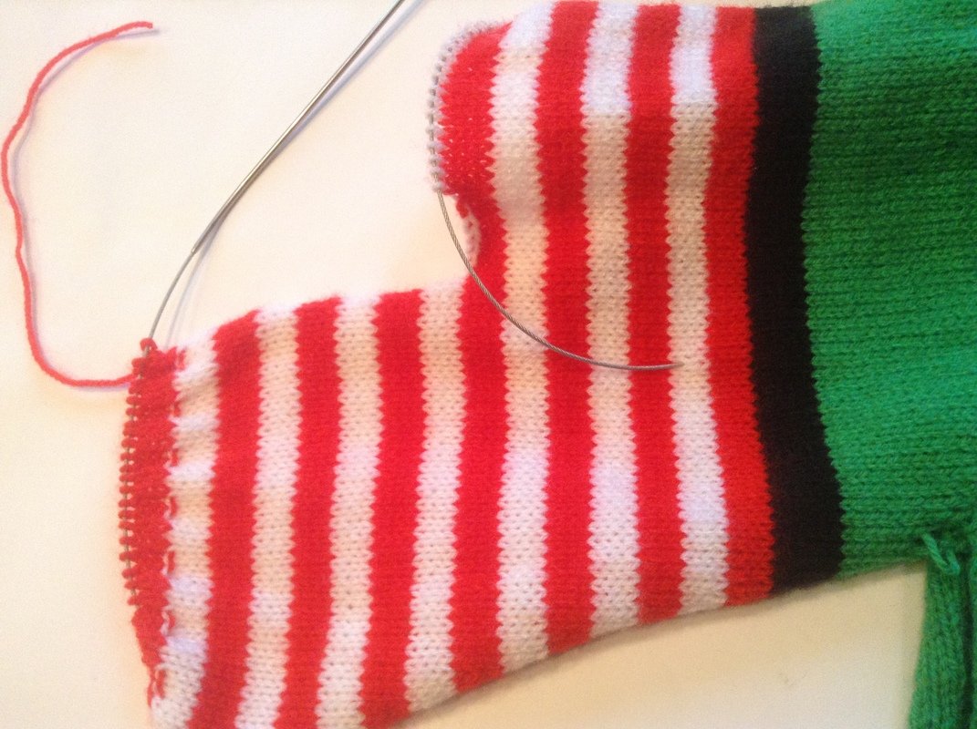 Die Füße werden angestrickt mit einem Nadelspiel.