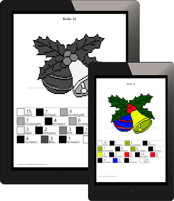 Die Anleitung enthält zusätzlich eine PDF Datei mit der genau abgezählten Maschenanzahl jeder Farbe pro Reihe. Diese Datei kann auf den eBook-Reader oder das Smartphone geladen werden um auch unterwegs bequem häkeln zu können. :)