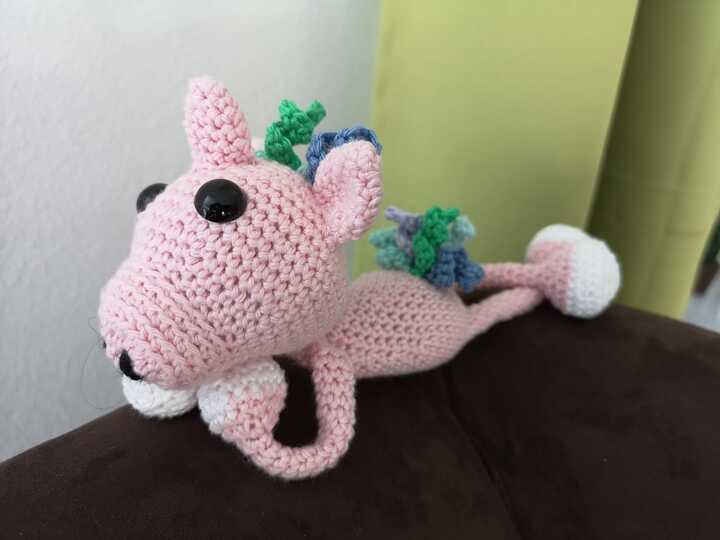 Das Schweinhorn wird, je nachdem welche Wolle ihr verwendet, ca 20 - 23 cm groß. Ihr könnt es in euren Wunschfarben häkeln, ich habe hier nur Beispiel-Farben verwendet.