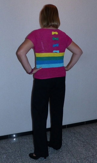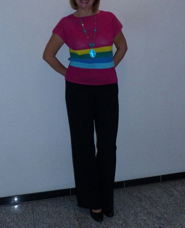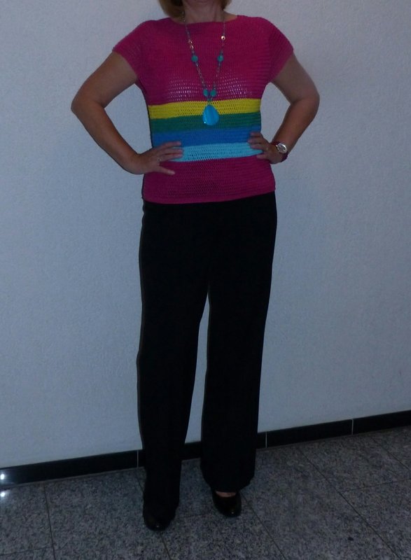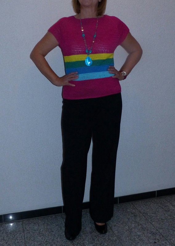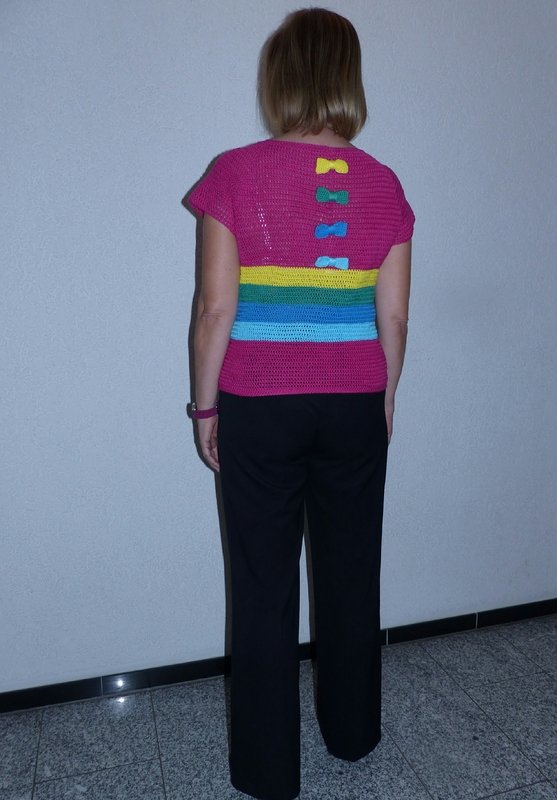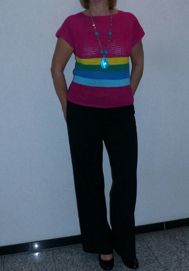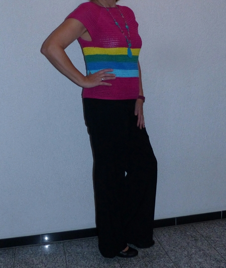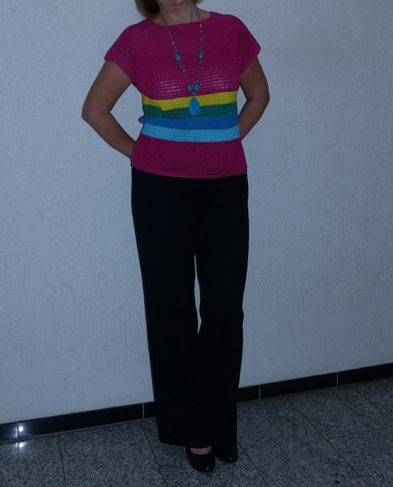 Diese süße Shirt kannst du in deinen Wunschfarben häkeln und es ist ein absoluter Hingucker zu Hose und Rock.