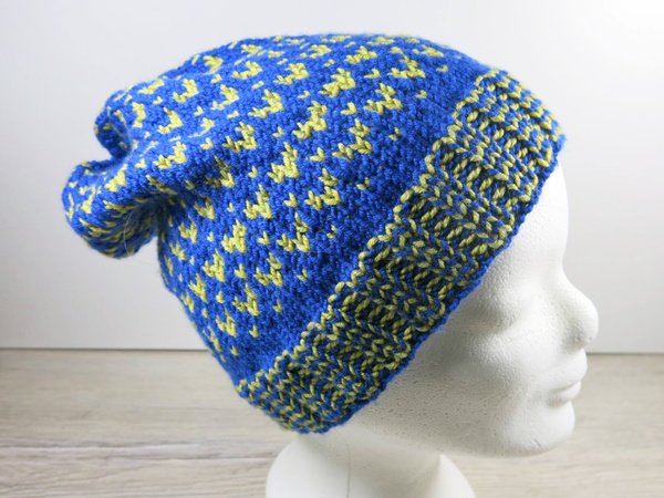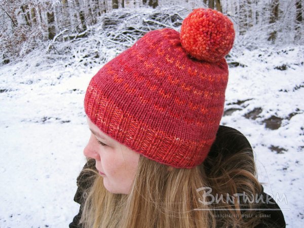 Bei einer Maschenanzahl von 20 M auf 10 cm (in Runden glatt rechts gestrickt) ist die Mütze für Kopfumfänge zwischen 44 und 60cm geeignet.