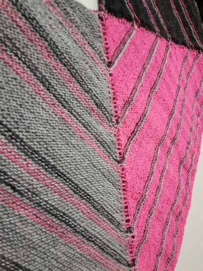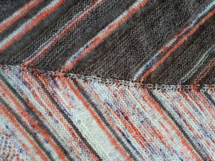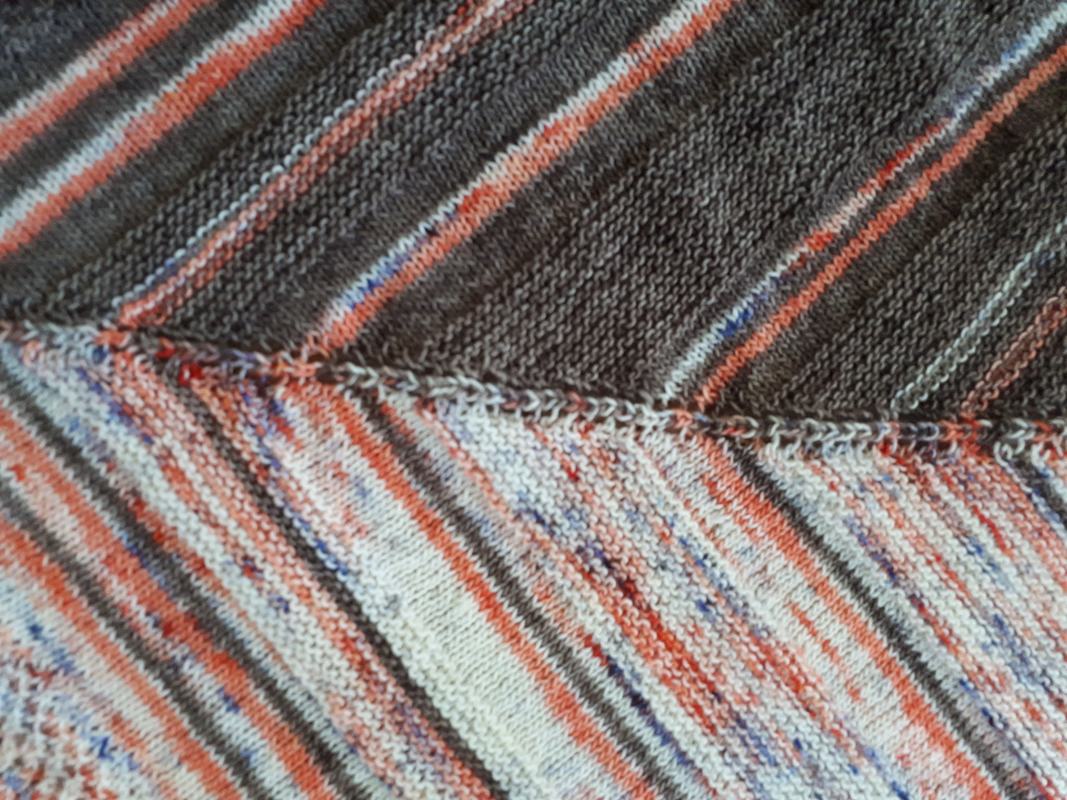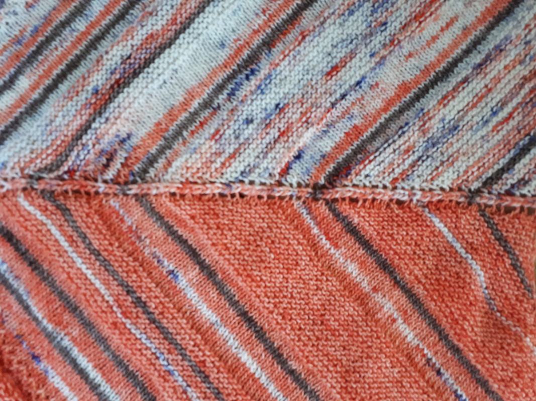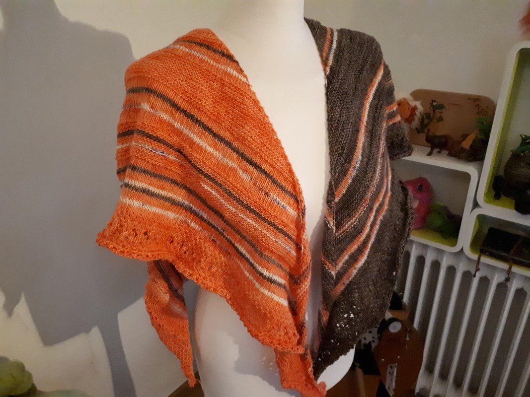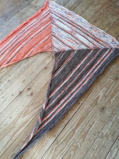 Für das gezeigte Lachs/Taupe Tuch wurden 3 Stränge Merino Single 100g/365m gefärbt von Locoporella