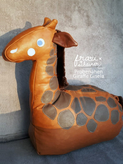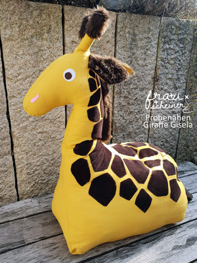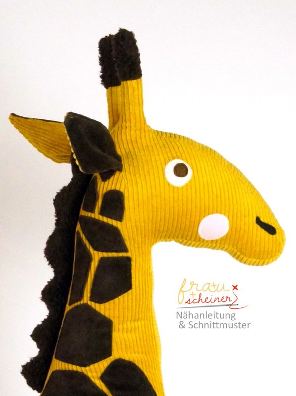 Nähtipp: Du kannst die Flecken applizieren oder ein Fellimitat mit Giraffenmuster zum Nähen benutzen. Nähe Gisela aus Plüsch, Cord, Leder oder festen Bezugsstoffen.