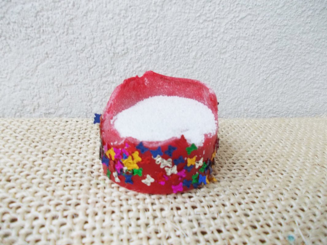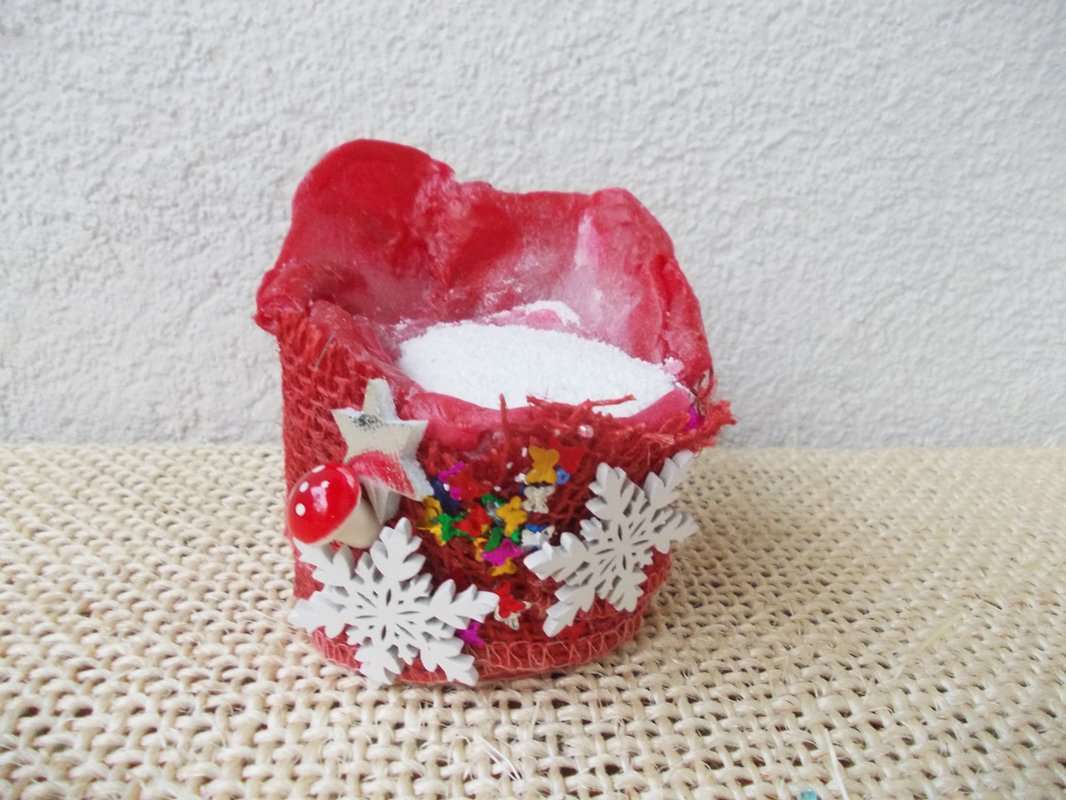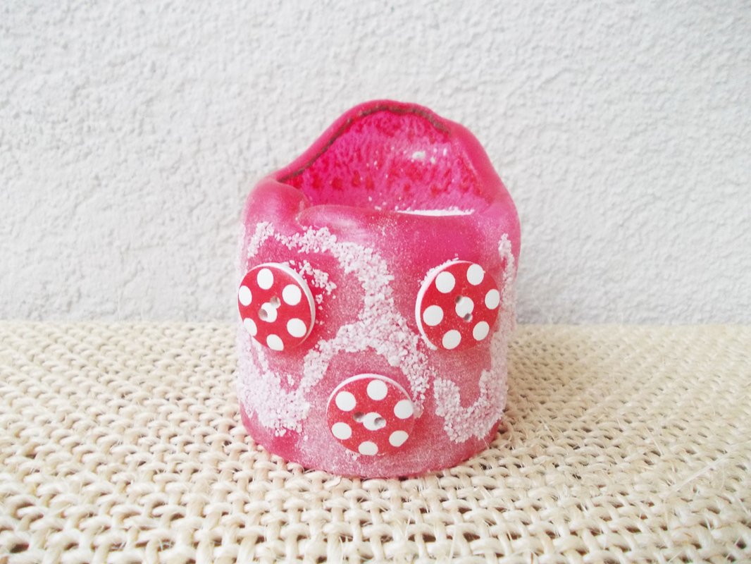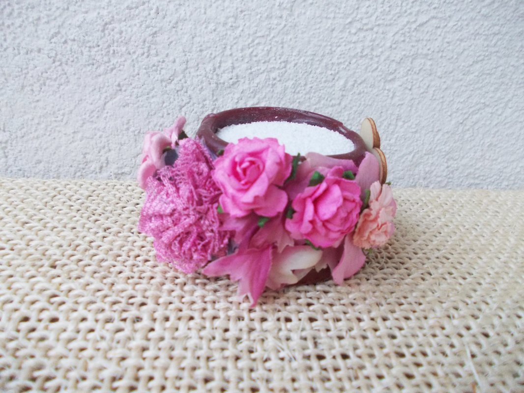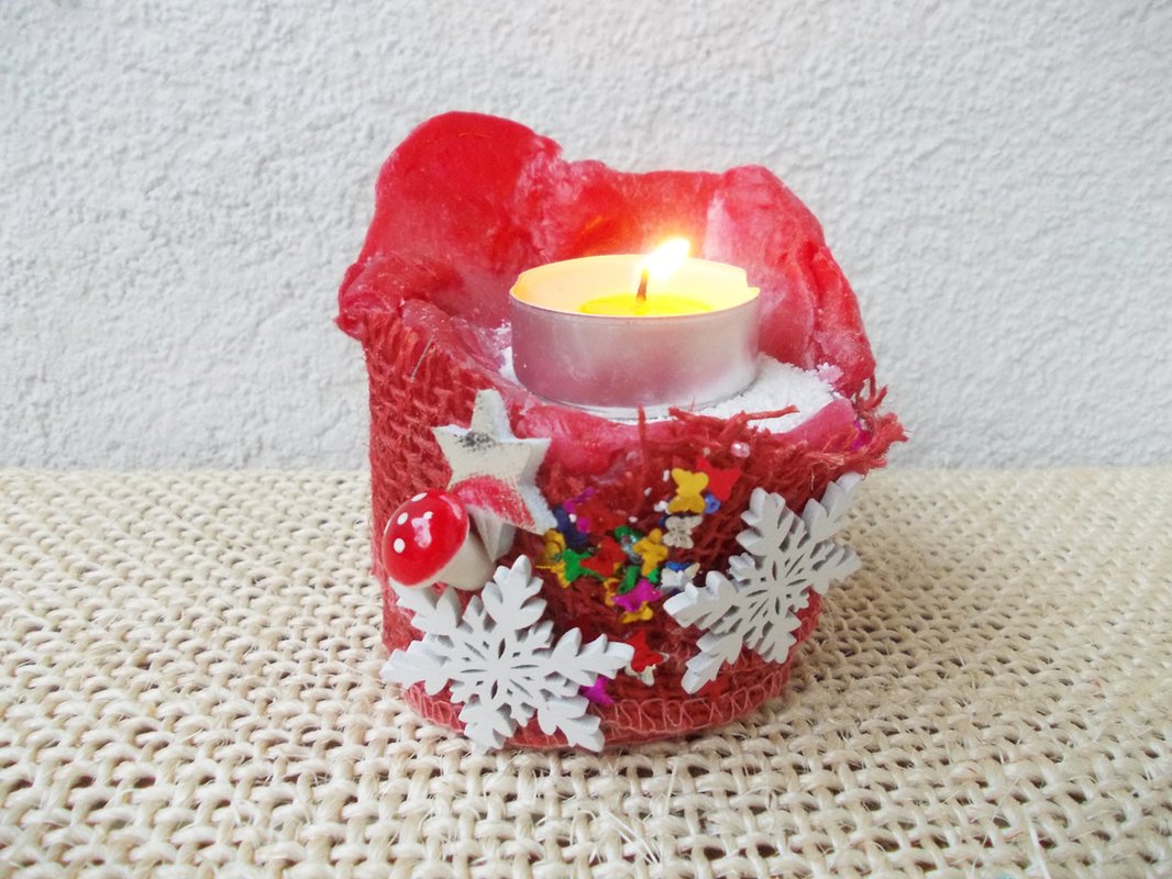 Da ich sehr viel Handarbeiten fertige, habe ich viele kleine Details, wie Perlen, Dekosand, Stoffblumen, Figuren mit Klebepunkt, Glitzerstreu und vieles mehr. Auch im Haushalt gibt es immer wieder kleine „Reste“, wie Stoffreste, Wollreste, welche verwendet werden können. Auch kleine Häkelblumen (Anleitungen gibt es in meinem Shop, auch gratis) können ein Kerzen-Blickfang werden.