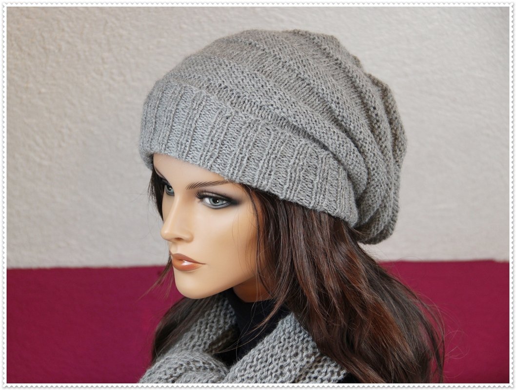 Das Set besteht aus einer modernen Slouchy-Mütze und einem passenden Schal, der auch als Loop gearbeitet werden kann. Beides ist leicht und anschmiegsam. Die Mütze passt sich durch das elastische Bündchenmuster dem Kopf der Trägerin an. In die Beanie-Form der Mütze passen auch lange Haare. Ihr könnt die Mütze mit ausgeklapptem Bündchen oder einmal umgeschlagen tragen - je nach persönlichem Geschmack. Der Schal ist längstgestrickt. Wenn man die beiden schmalen Enden des Schals zusammen näht, hat man einen Loop.