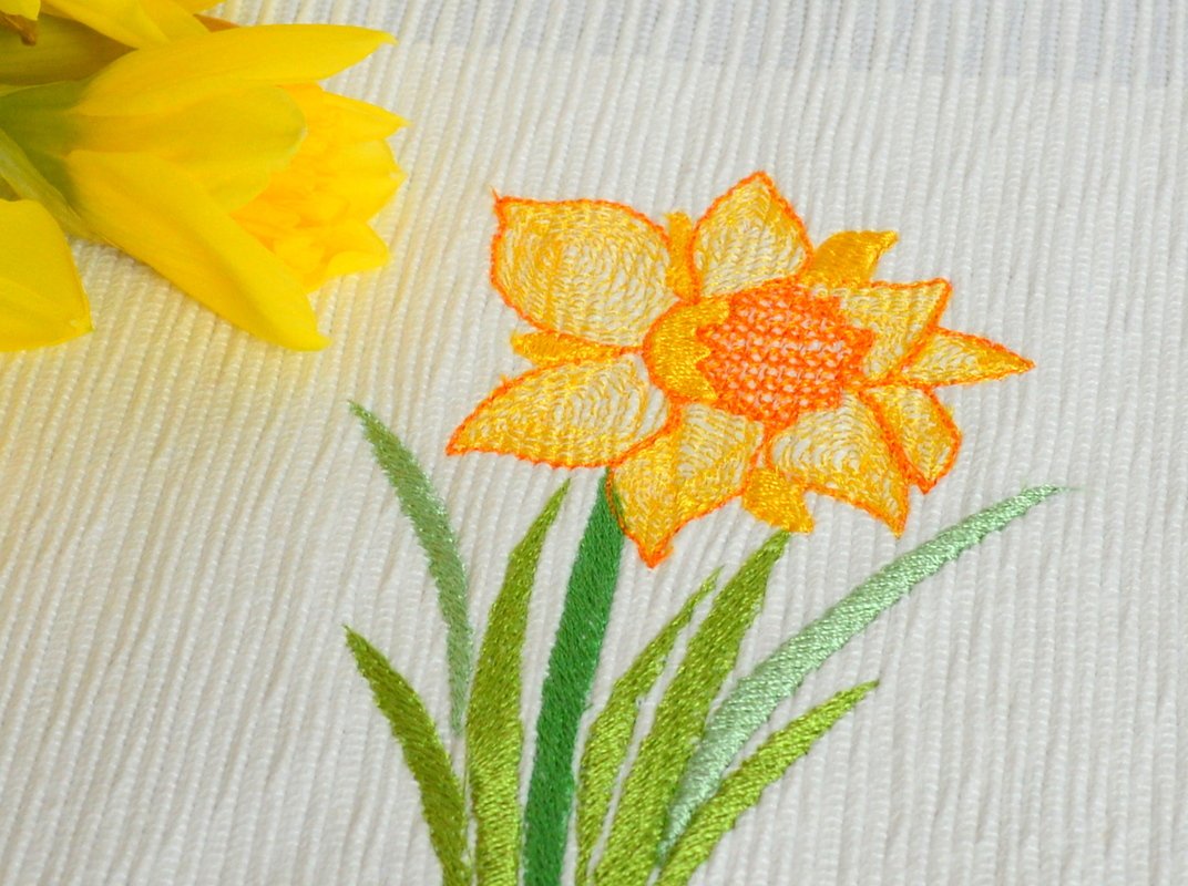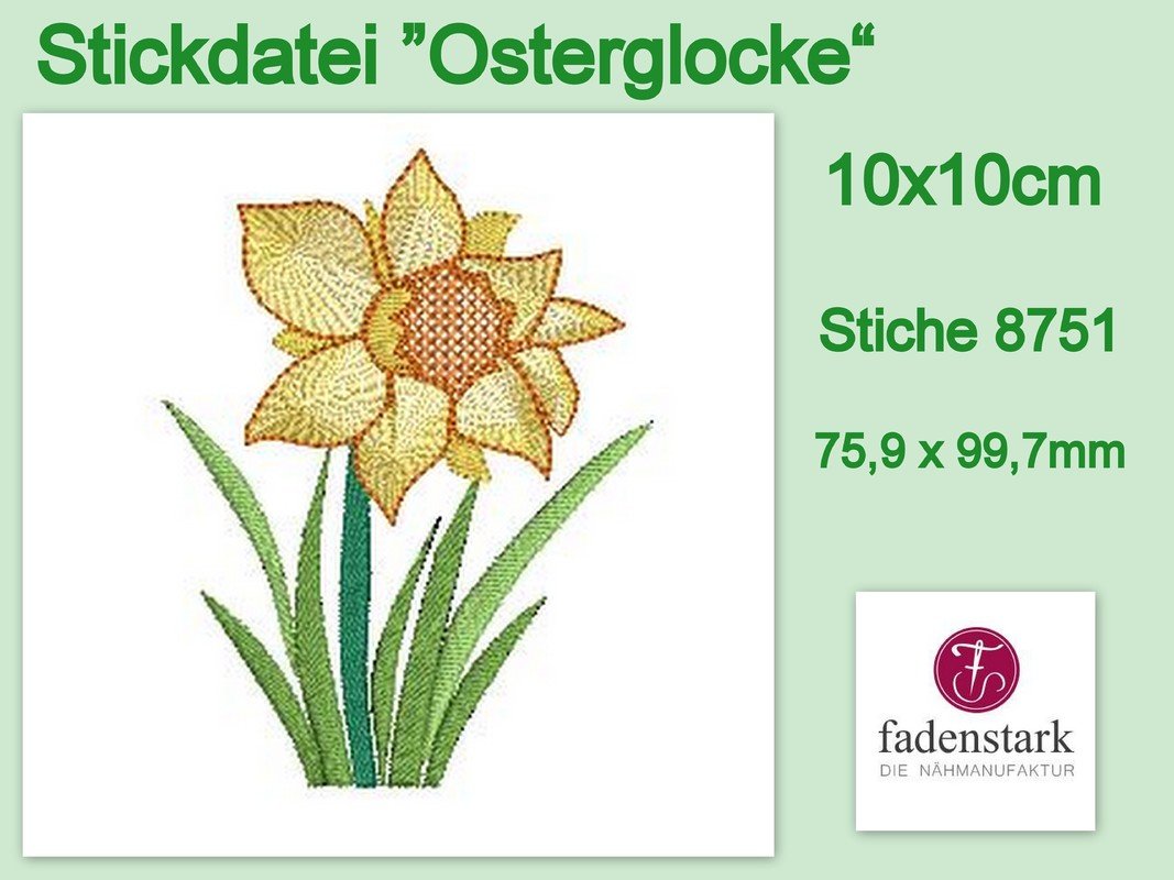 Eine Stickdatei, die nach dem Frühling ruft: eine Osterglocke, verwendet werden verschiedene Sticharten: u.a. Relief-, Stepp-, Motiv-, Kreuzstich!! Mit dieser Stickdatei könnt ihr eure eigene Tischdekoration zu Ostern aufpeppen: egal ob auf einer einfachen, weißen Tischdecke oder auf Stoffservietten, immer ein Hinkucker !!
