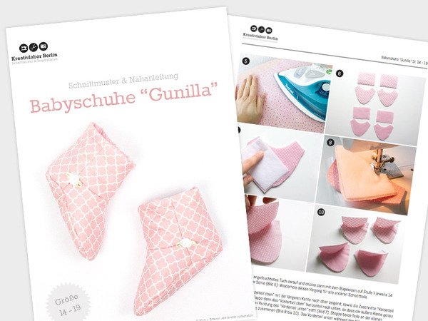 Die Babyschuhe Gunilla passen Neugeborenen und Babies bis zum Alter von 10 - 12 Monaten. Zum Rutschfestmachen der Schuhe kannst du am Ende optional Sockenstop oder Latexmilch auftragen. Wahlweise kannst du für die Sohle auch Leder oder Gumminoppenstoff verwenden.