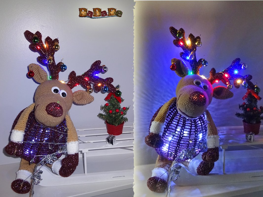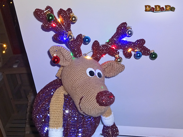 Das Rentier hat nicht nur die Lichterkette verschluckt, es hat sich auch noch mit Kugeln geschmückt.