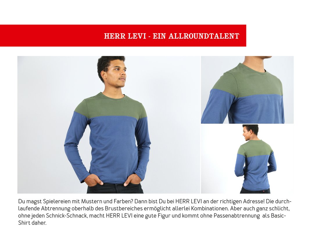 Du magst Spielereien mit Mustern und Farben? Dann bist Du bei HERR LEVI an der richtigen Adresse! Die durchlaufende Abtrennung oberhalb des Brustbereiches ermöglicht allerlei Kombinationen. Aber auch ganz schlicht, ohne jeden Schnick-Schnack, macht HERR LEVI eine gute Figur und kommt ohne Passenabtrennung als Basic-Shirt daher.