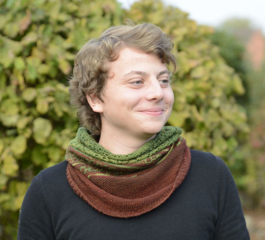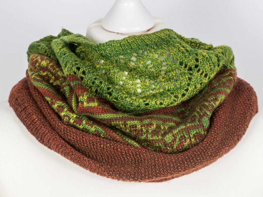 Der Loop wird in Runden gearbeitet, das Farbmuster wird in der Mosaik-Technik gestrickt, es wird immer