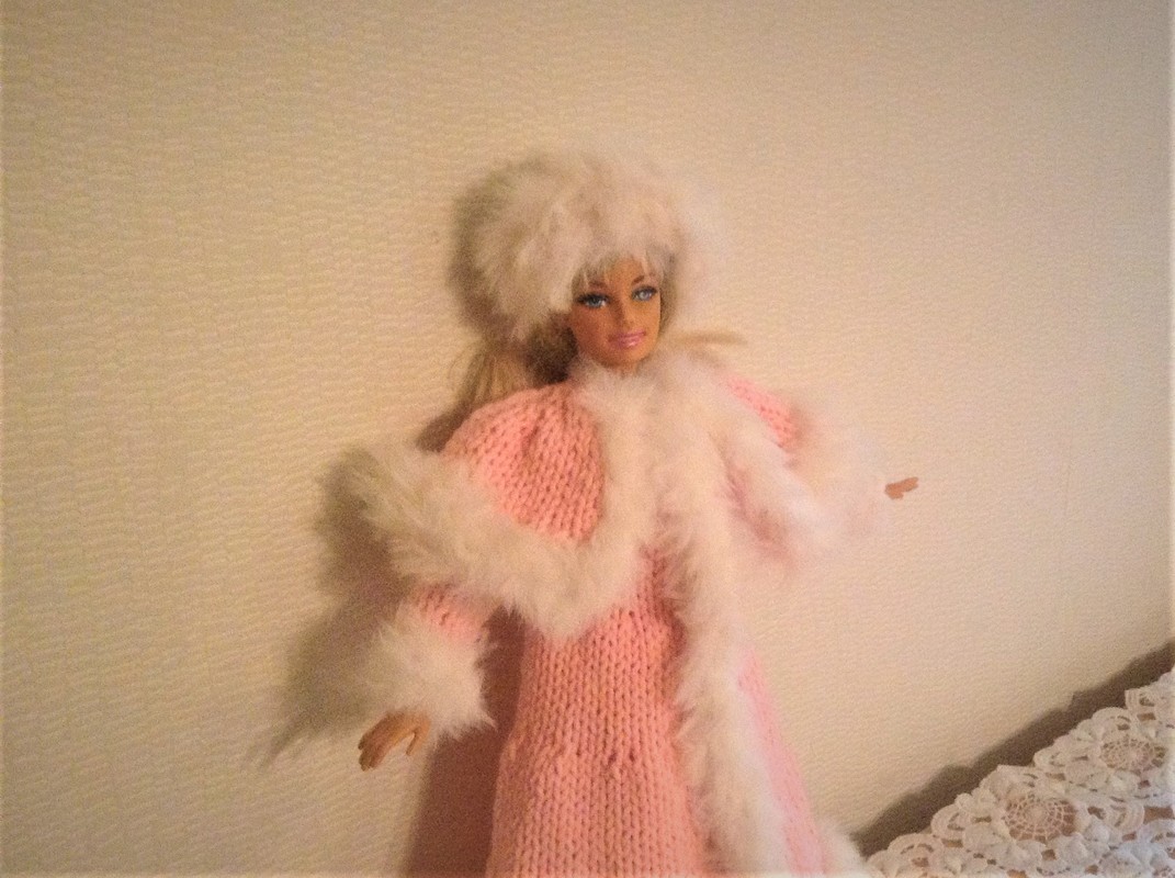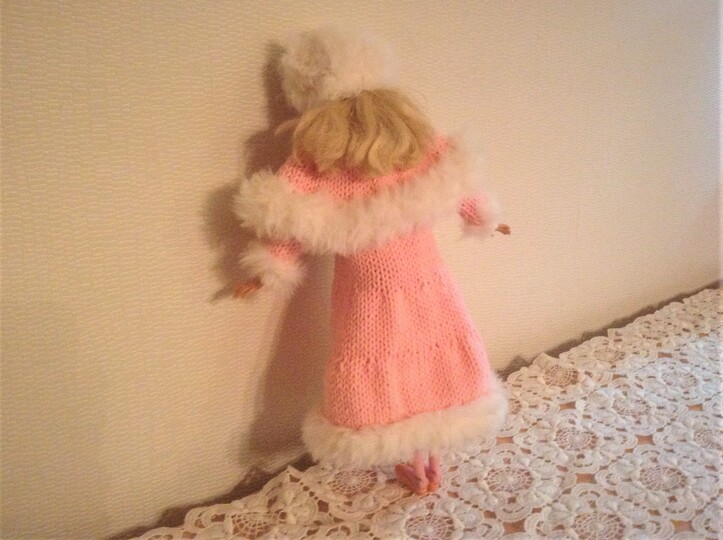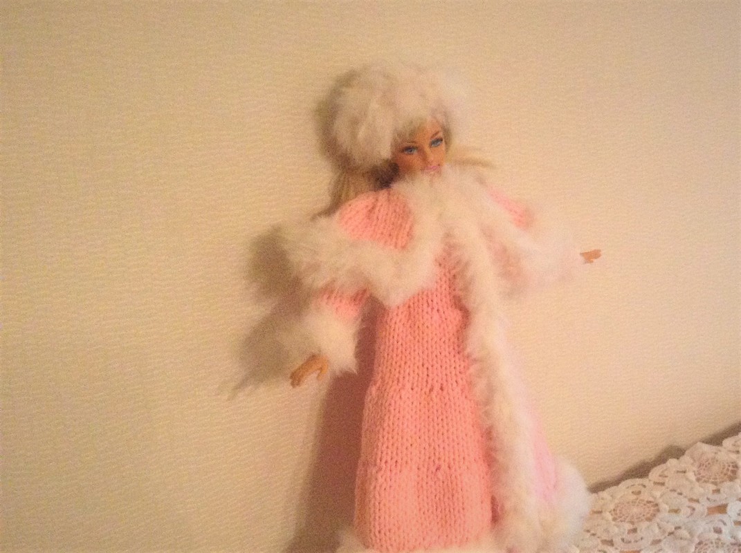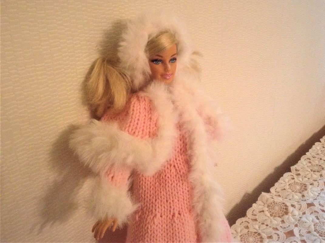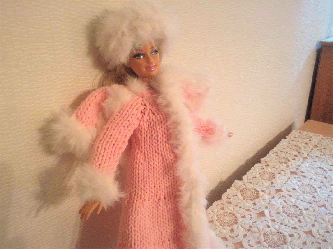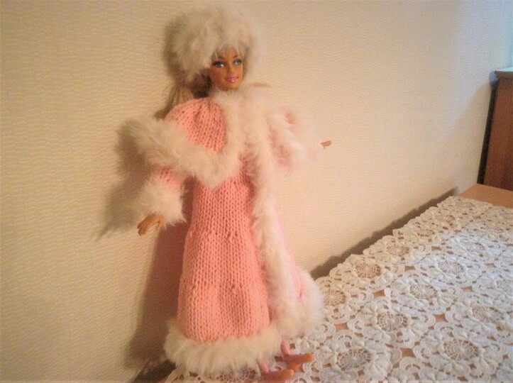 Eine Strickanleitung für einen Wintermantel mit Cape und Pelzkanten (synthetischs Garn) und eine Pelzmütze für Modepuppen von 29cm Größe.