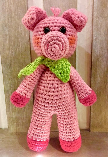 Gehäkelt wird das Schweinchen mit einer NS 3,0 und einem Garn mit ca. 112m Lauflänge auf 50g (z.B. Woll Butt Schulgarn, Gründl Cotton Fun). Mit der angegebenen Wolle wird es ca. 20 cm groß. Die Größe kann natürlich individuell über die Wolle und Nadelstärke angepasst werden.