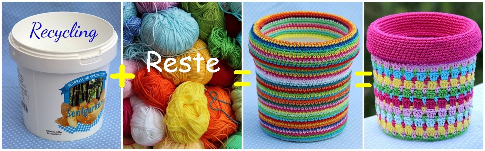 Das Häkeln der 2 Modelle geht ganz kinderleicht und ist auch für Häkelanfänger sehr gut machbar. Wir häkeln aus Luftmaschen, festen Maschen, Kettmaschen und Stäbchen eine Hülle für einen handelsüblichen Plastikeimer (1 kg Inhalt). Wenn Ihr das nächste Mal eine Familienportion Joghurt oder Senfgurken aus dem Supermarkt kauft, könnt Ihr diesen Eimer später gleich verwenden. Und keine Angst vor dem Fädenvernähen, ich zeige Euch meine Tricks, wie man sich das ersparen kann.