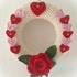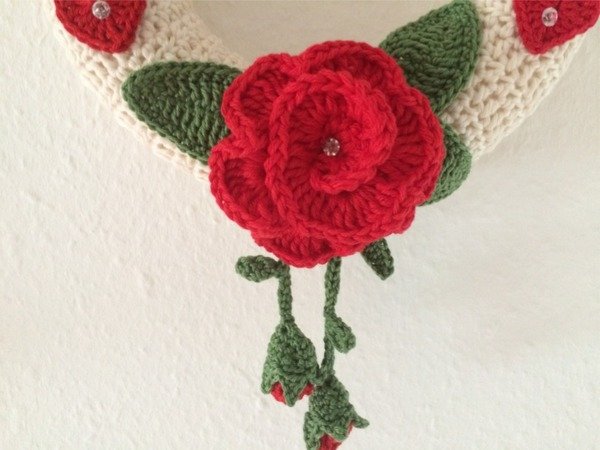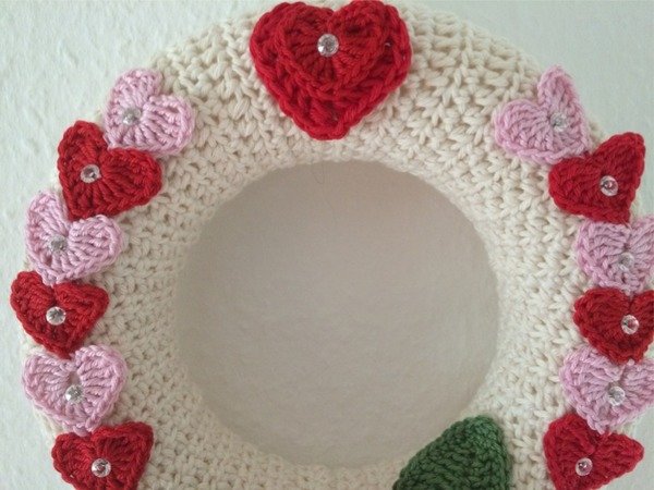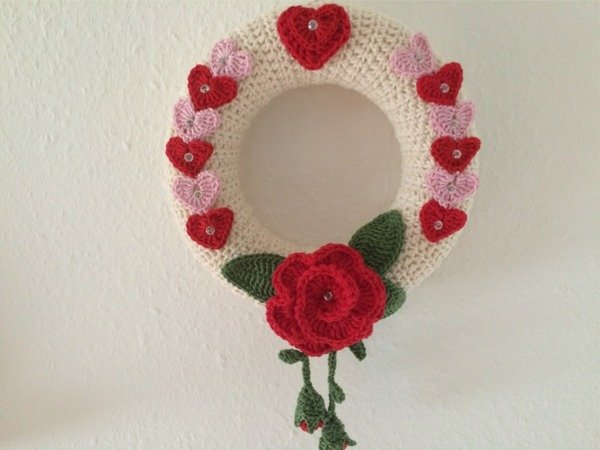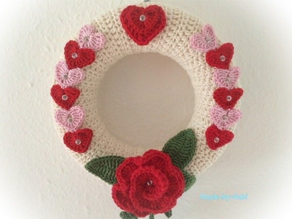 Materialbedarf: Baumwolle in Wollweiß, Rot, Rosa und Grün, Häkelnadel 3 und 4,5, Styroporkranz 22 cm Durchmesser, Stecknadeln.