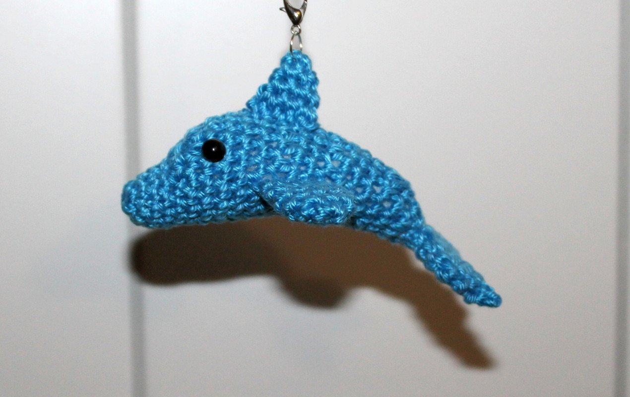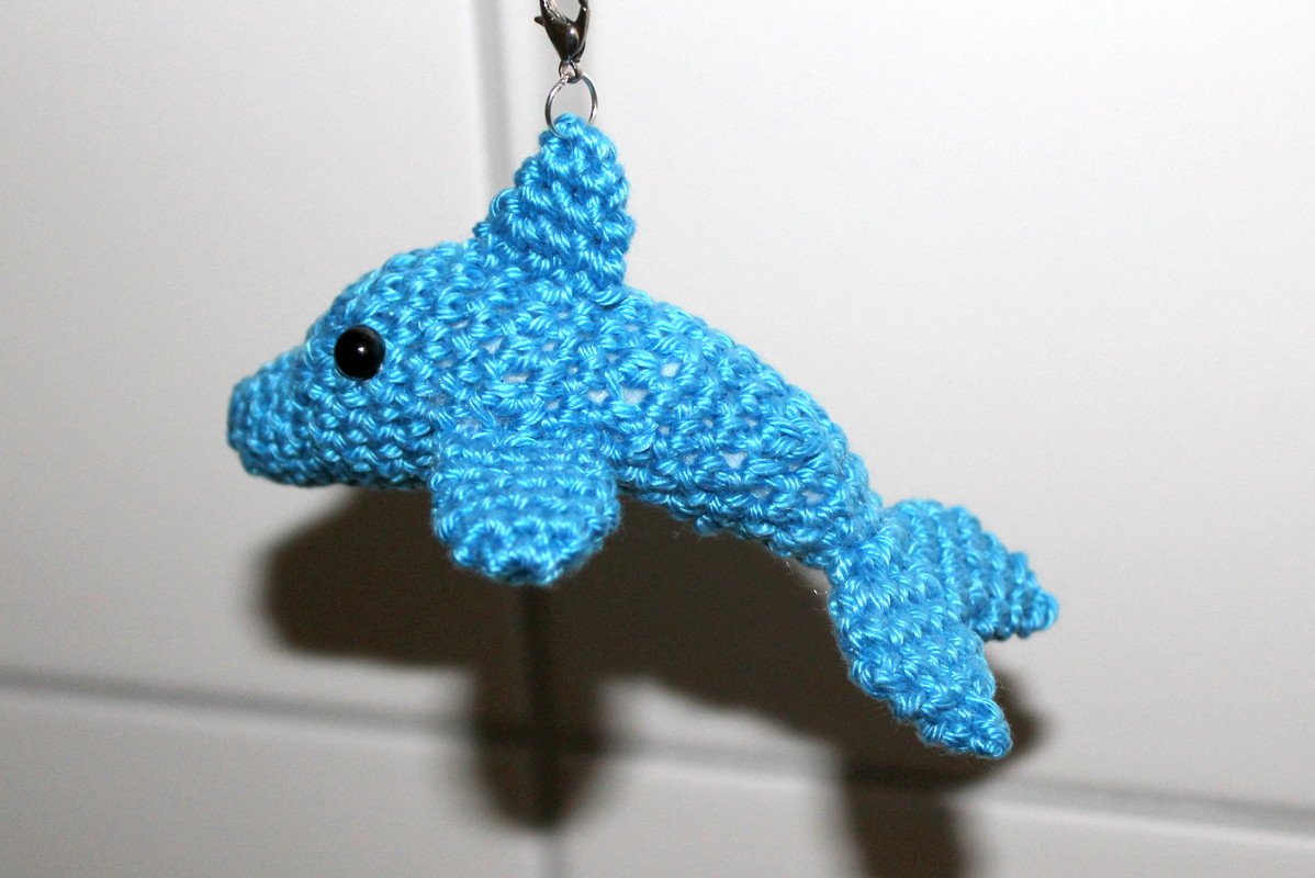 Der Delfin wird fertig gehäkelt ca 10 cm lang, bei Benutzung von 2,5- 3er Wolle.