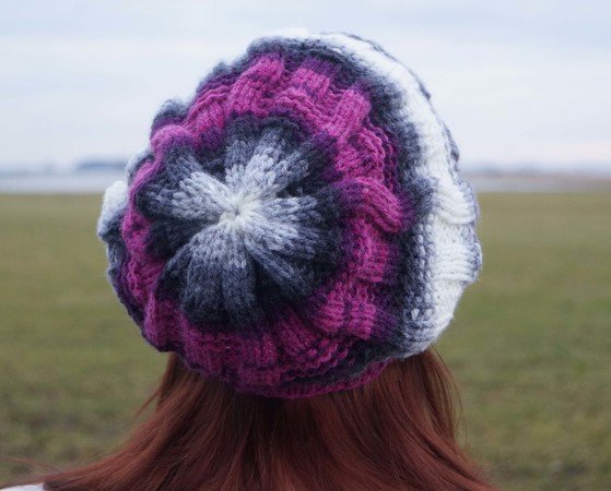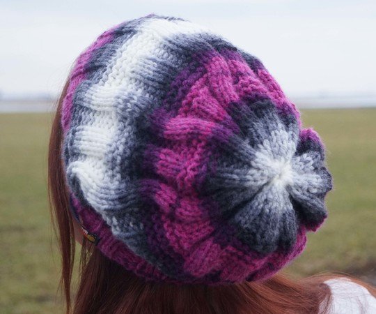 Diese Zöpfe wellen sich blitzörmig bis zur Spitze der Mütze, in der sie zusammenlaufen. Es sind keine komplizierten Muster nötigt um den tollen Effekt zu erhalten.
