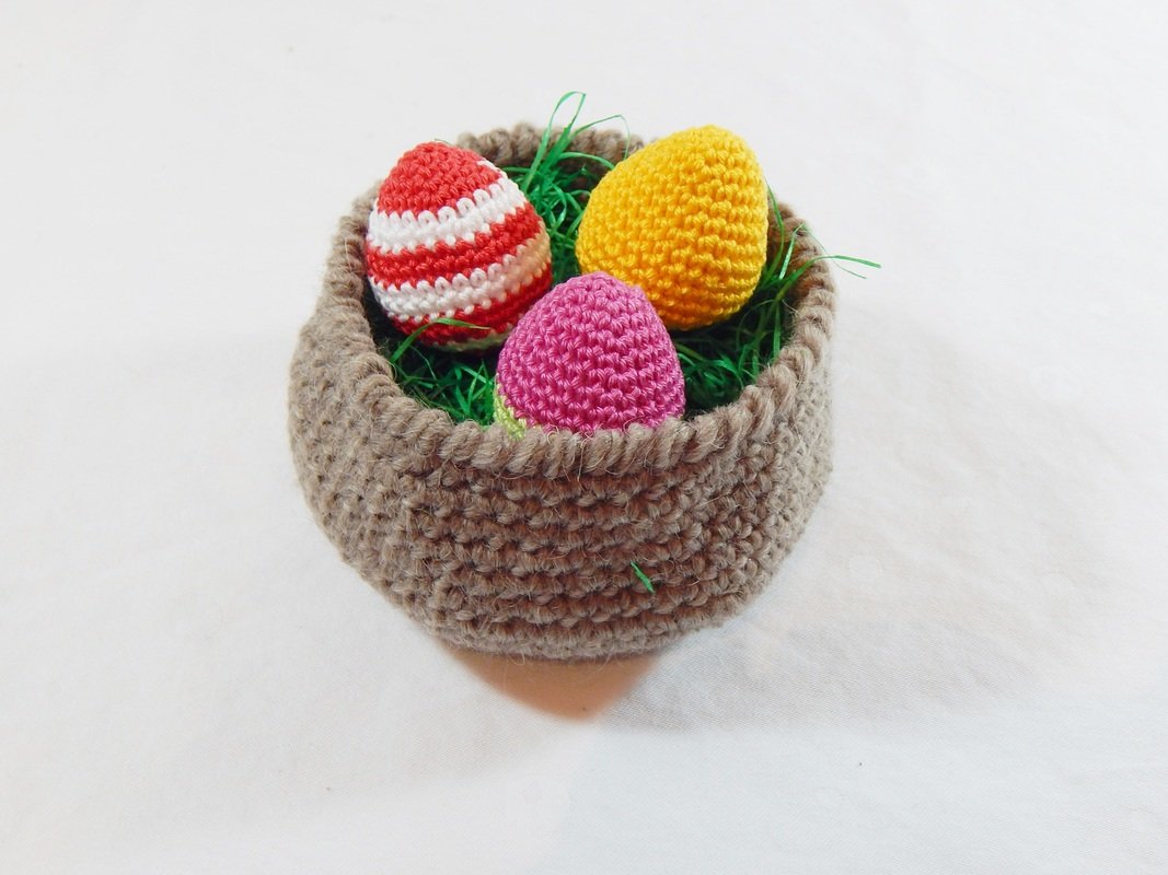 Beschrieben wird in vielen einzelnen Schritten, wie Du ein paar kleine Ostereier in einem Osterkörbchen in windeseile selbst häkelst.