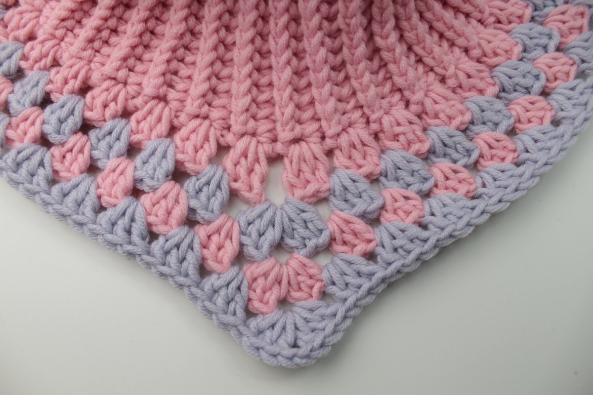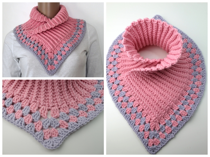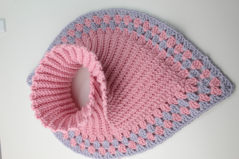 Der Schalkragen ist in einem Viereck gearbeitet, zusammengeklappt und umgähäkelt.