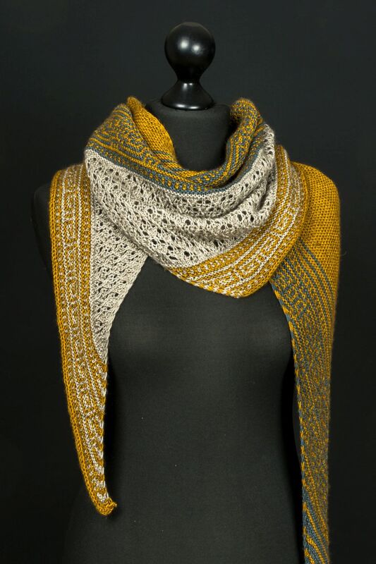 Dieses langgezogene, asymmetrische Dreieckstuch erinnert mit seinen Mosaik-Mustern in Naturfarben an griechische Ornamente. Die Muster sind einfach zu stricken, es wird nie mehr als eine Farbe pro Reihe gleichzeitig genutzt.