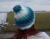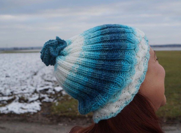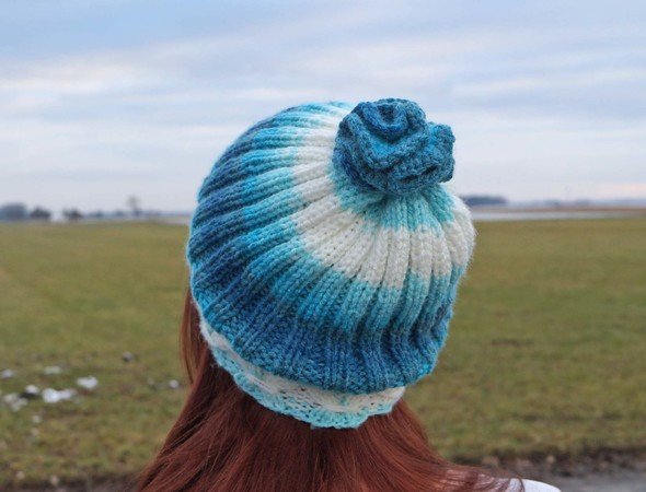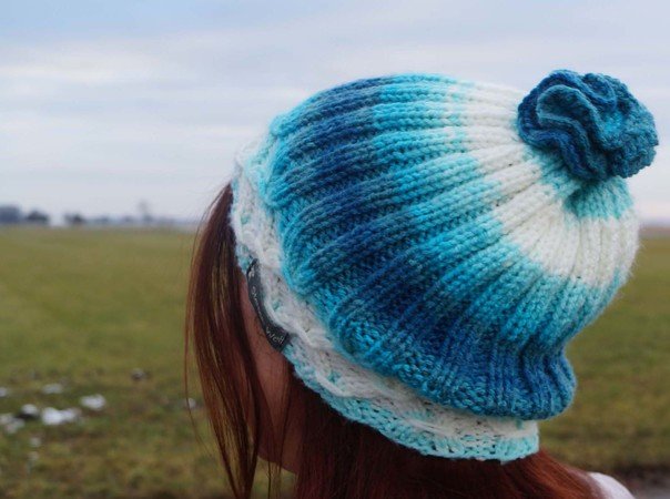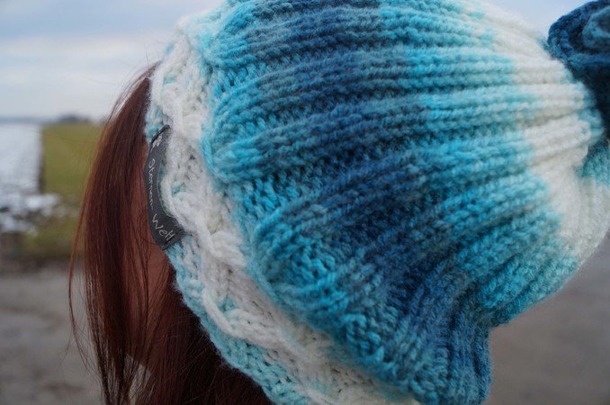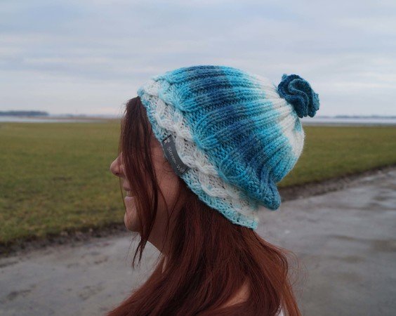 Calypso ist eine Mütze die mit ihren verschiedenen Blautönen an das weite Meer erinnert - tiefblau mit weißen Schaumkrönchen. Dazu hat sie einen hyperbolic Bommel bekommen, dessen korallenförmige Struktur genau dazu passt.