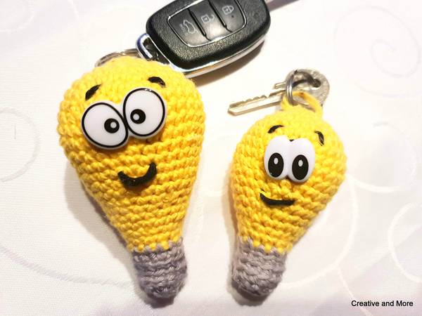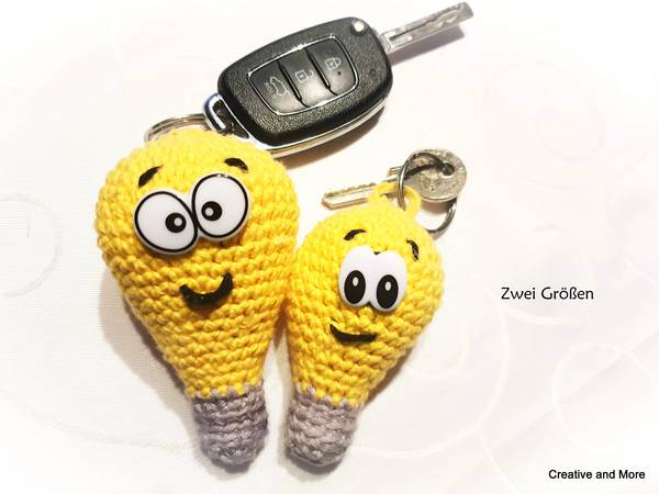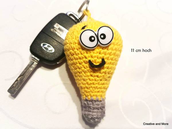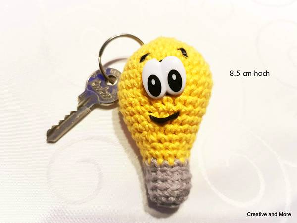 Die Anleitung ist kinderleicht und du kannst die Glühbirne in zwei verschiedenen Größen nachhäkeln ( 8,5 cm und 11 cm). Je nachdem wie groß dein Schlüssel(bund) ist, häkelst du dir die passende Größe.