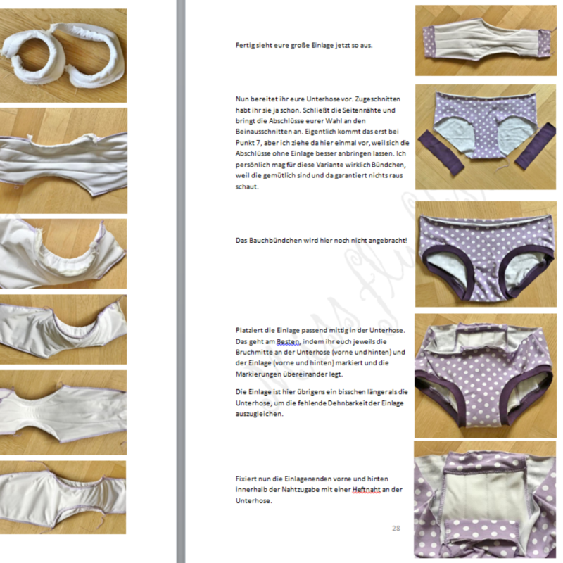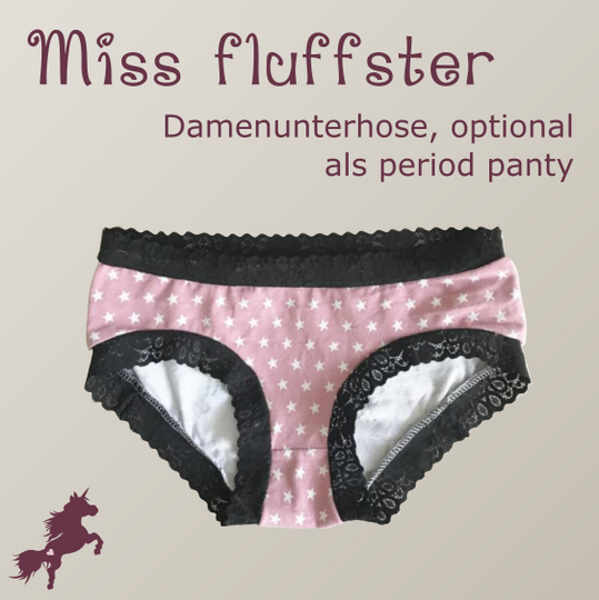 Dabei ist Miss fluffster sehr vielseitig. Sie kann verspielt aus Jersey und Bündchen, elegant mit Wäschegummi oder sexy mit Spitze genäht werden. Und damit wir dem Thema des fluff stores treu bleiben, beschreibe ich zwei optionale Saugeinlagenvarianten. Mit der kleinen, eingenähten Saugeinlage habt ihr euer Tassen-Back-up direkt dabei und spart euch die Slipeinlage. Mit der großen Saugeinlage kommt ihr gut geschützt vor Pannen auch bei starker Periode oder Wochenfluss über die Nacht. Das eBook beschreibt auf 44 Seiten alle Varianten, ein zusätzliches Kapitel zum Thema Schnittanpassung ist enthalten.