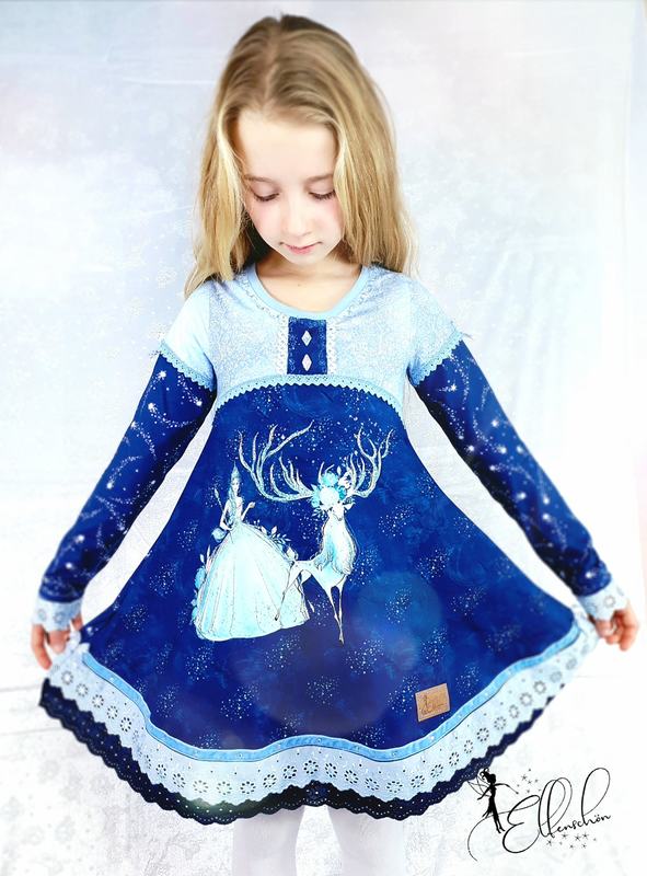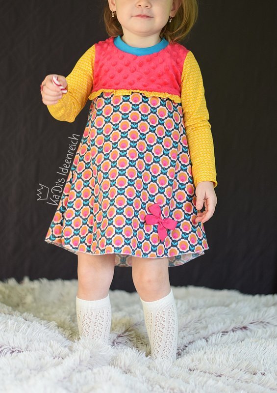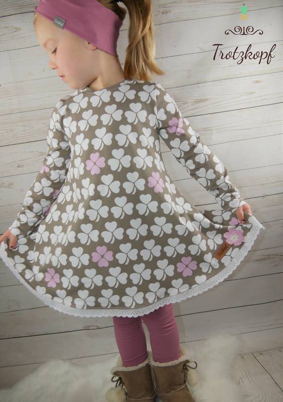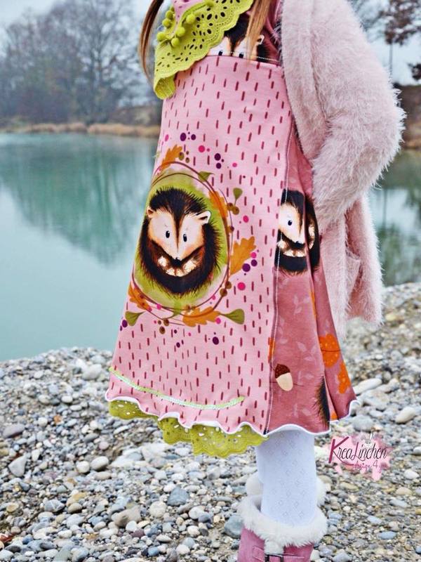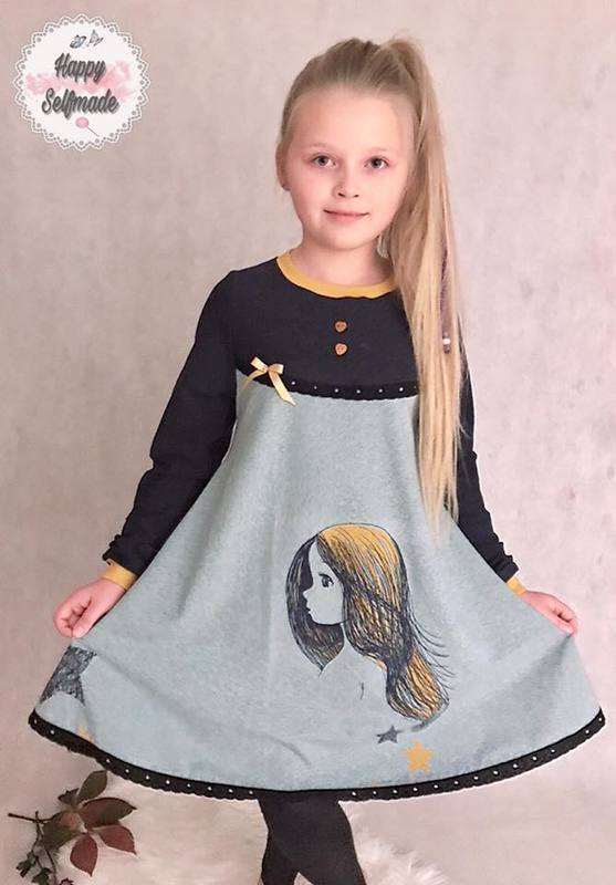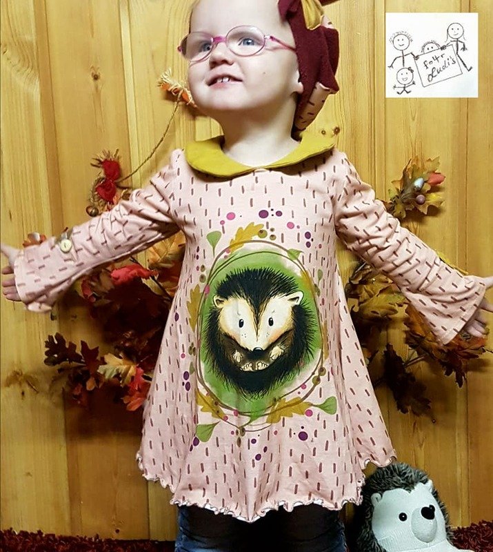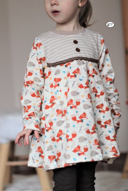 Anja ist ein Basic-Tunikaschnitt, den ihr von Gr. 86 – 164 nähen könnt. Durch die nach unten hin weit ausladende A-Form des Schnittes legt sich die Tunika beim Tragen seitlich in Falten und bekommt so einen wundervoll verspielten Look. Wichtig hierfür ist, dass der Schnitt zwingend aus Jersey oder anderen, leichten, dünnen, dehnbaren Stoffen genäht werden sollte – ansonsten geht der Effekt verloren.
